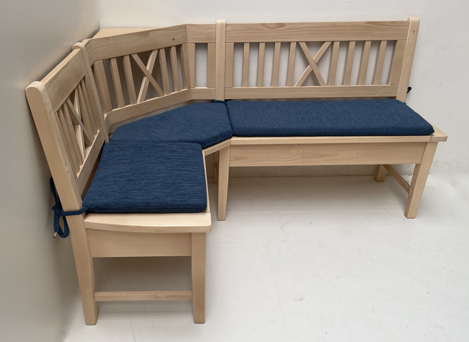 Eckbank Nürnberg Fichte 165/125 cm mit Kreuzsprossen, Rosner gewachst, Polster genäht Landshut blau