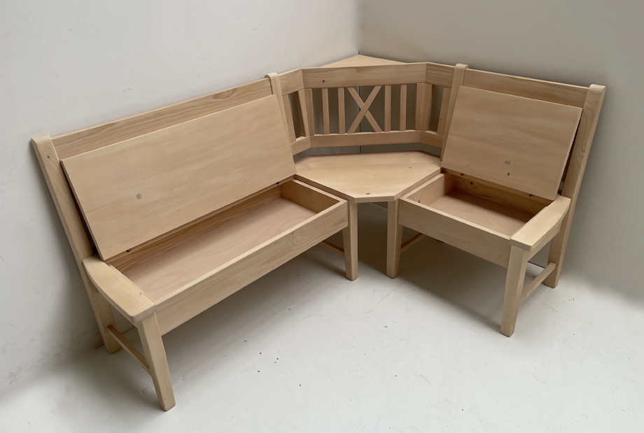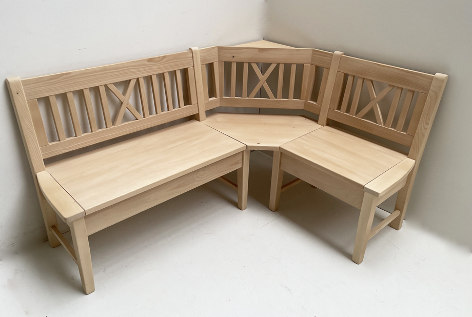 1 Eckbank Nürnberg, Kreuzsprossen, mit Truhen, Schenkelmaß Stellmaß A>125/165 cm,