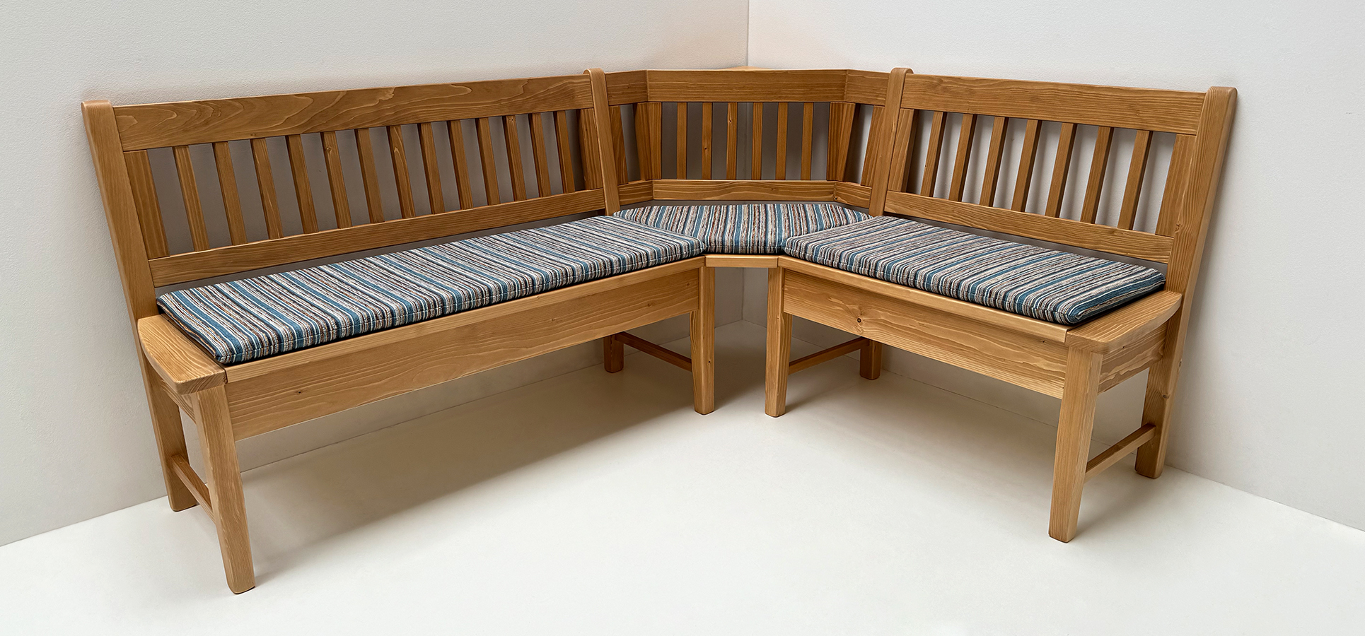 Eckbank Nürnberg 150/190 cm mit Sprossen, Fichte Rosner lackiert, Polstersatz genäht, Venice 101