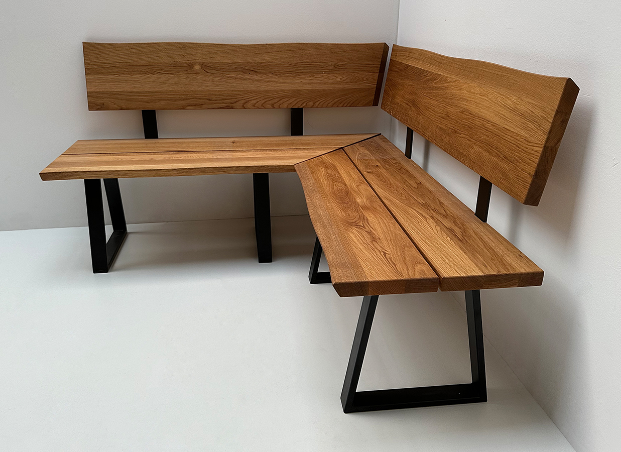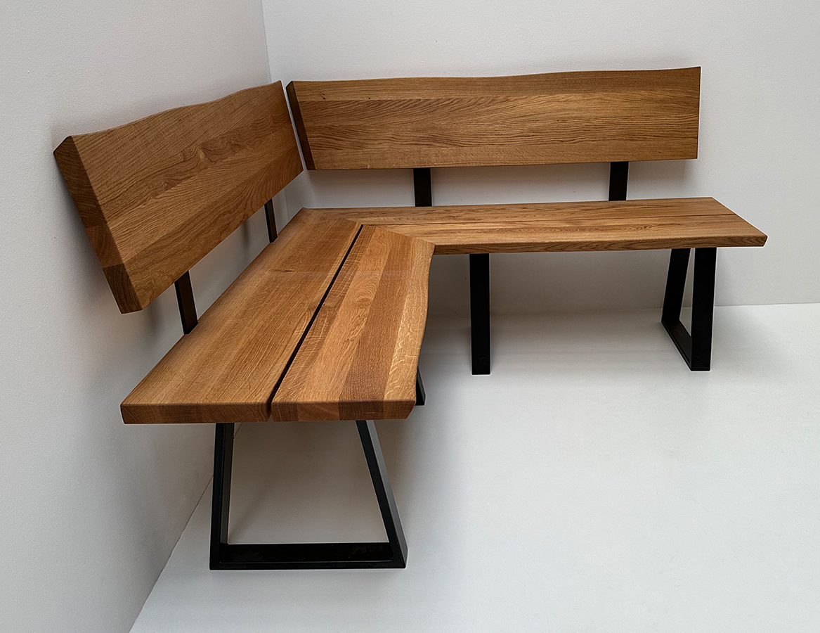 Eckbank Baumbank Oviedo 160/160 cm Wildeiche massiv geölt, Metallwangen schwarz