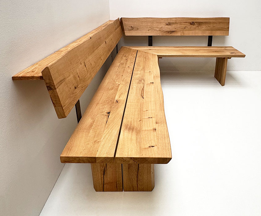 Eckbank Baumbank Oviedo, Sondermaß 250/170 cm, beidseitige Ablagenverbreiterung, Wildeiche massiv