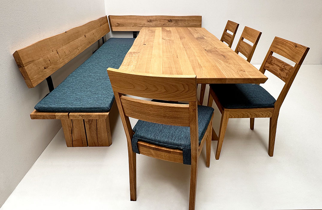 Eckbankgruppe Oviedo 250/170 cm, Tisch Larissa 90/200 cm, Baumkante, 4 Stühle, Polster Verano 672