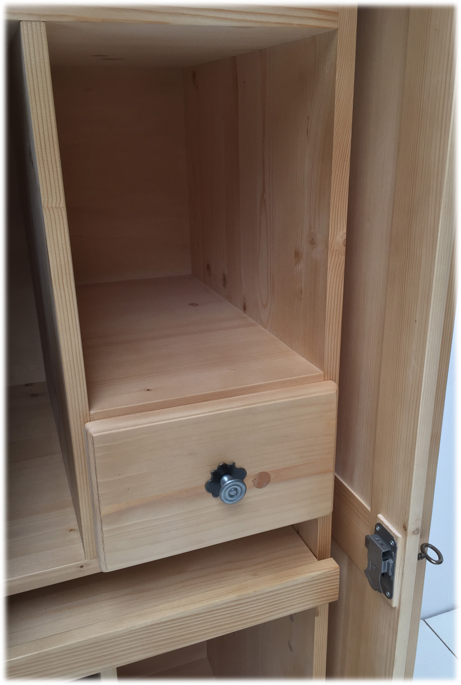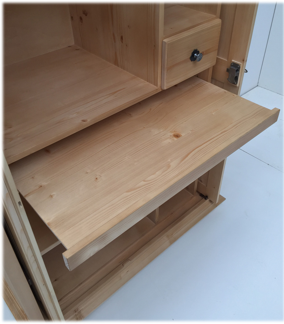 Abm. 110/156/61cm (B/H/T) , Innenmaß T56 cm, 2 Einschubtüren , Auszugsboden, Fächer für PC, Bildschirm, Drucker, Papier, CD/DVD, Fichte massiv, Farbton Rosner gewachst