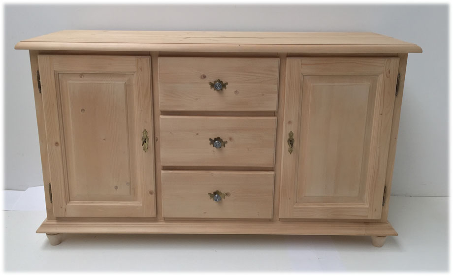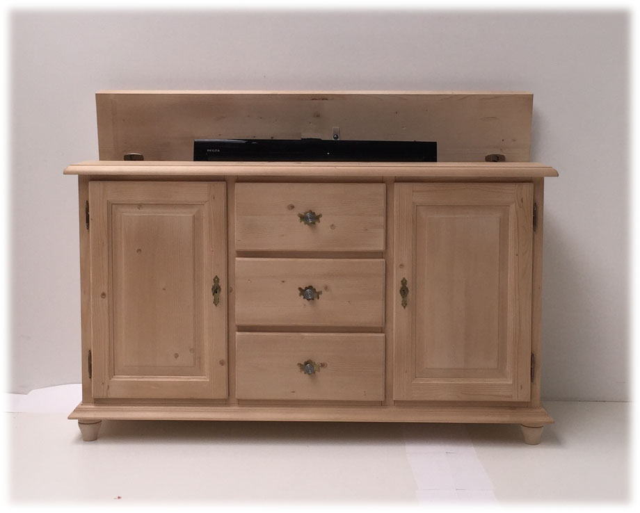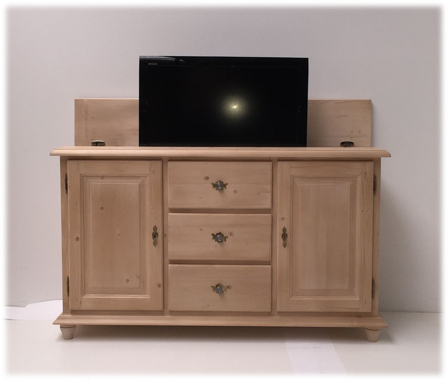 für Flat TV 30-42 Zoll, 2 Türen 3 Schubladenfronten aufklappbar, Stauraum für CD DVD, 1 Flat TV Antrieb, Abm. 150/87/47 cm (B/H/T), Fichte massiv, Rosner gewachst