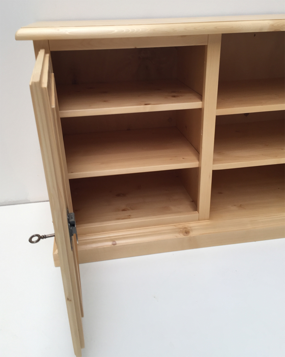Abm. 160/75/45 cm, B/H/T mit Sockel, aussenliegende Scharniere , Mittig offenes Teil mit 2 Böden, 2 Fachböden frei einteilbar verstellbar, Fichte massiv, Rosner Hartwachs,