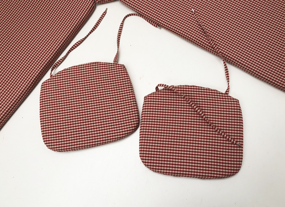 Ausführung lose genäht mit Reissverschlüßen zum Abziehen und Bänder zum Anbinden! Fest eingenähte Bänder aus dem gleichen Möbelstoff, Enden der Bänder gekrimpt ! Gegen Verrutschen mit Antirutschunterlage !