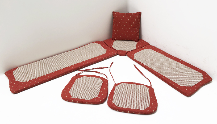 Polstersatz lose genäht für Eckbankgruppe Amberg klein 150/185 cm, inkl. 1 Sofa Kissen 40/40 cm gratis !! Alles in Ausführung lose genäht mit Reissverschlüßen zum Abziehen und Bänder an den Stuhlkissen zum Anbinden ! Stabile fest eingenähte Bänder aus dem gleichen Möbelstoff, Enden der Bänder gekrimpt ! Gegen Verrutschen mit Antirutschunterlage !