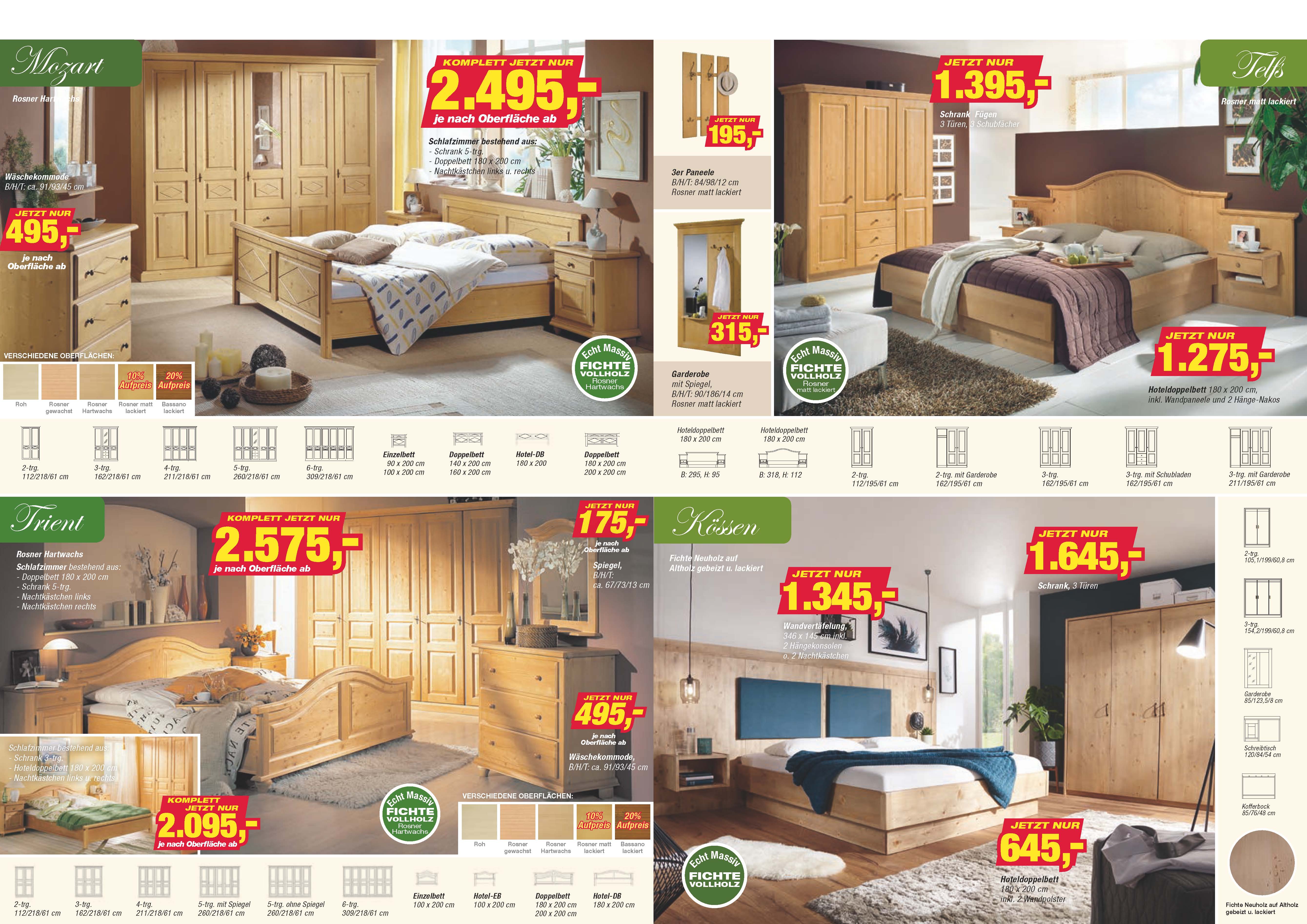 Der neue Prospekt Wohnen im Landhaus Stil 2-2018 ist druckfrisch erschienen. Interessante Angebote zum Schlafzimmerprogramm DAVOS, Fichte Rosner Hartwachs, Schlafzimmerprogramm MOZART mit Raute, in Fichte Hartwachs, Schlafzimmerprogramm TRIENT, Fichte Hartwachs mit seinen vielen verschiedenen Kombinationsmöglichkeiten! Objektschlafzimmer TELFS und KÖSSEn, mit geschlossenem Sockel bei den Betten, auf Altholz gebeizt und lackiert. Eckbankprogramm FÜSSEN, neu un auch auf ALTHOLZ gebeizt und lackiert, Eckbankprogramm PROVENCE in Fichte in verschiedenen Farbtönen lieferbar ! Kastenmöbelprogramm FÜSSEN, in vielen verschiedenen Ausführungen. Sofa Liege CHIEMGAU in vielen verschiedenen Lagerstoffen preisgleich lieferbar !