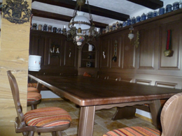 1 Eckbank im Schenkelmaß 200/350 cm, ohne Truhen, starker Sitz und starke Wangen, gerade Kasetten, Aussenwangen geschnitzt , 1 Aufsatz Wandverkleidung 100 cm mit Kasetten, mit offenem Eckkapitel, Ablage oben 12 cm tief, 1 Tisch 120/270 cm , Modell 4510 ohne Schubladen, ohne Fußrahmen, Fichteplatte 4 cm stark, Profil R20, 6 Stühle Modell WS-20, 1 Polstersatz für Eckbank und 6 Stühle, Polsterplatte , Stoff Edmonton rot, 1 Liege Chiemgau, Kopfteil Links, Stoff Edmonton rot, Alles in Fichte massiv, Farbton Rosner Torf 09 gebeizt und lackiert