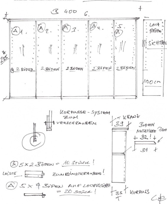 5 Korpusse, verdeckte Montage mit je 6 Fächern (5 Böden), Nutztiefe Böden 32 cm Gesamttiefe 39 cm !