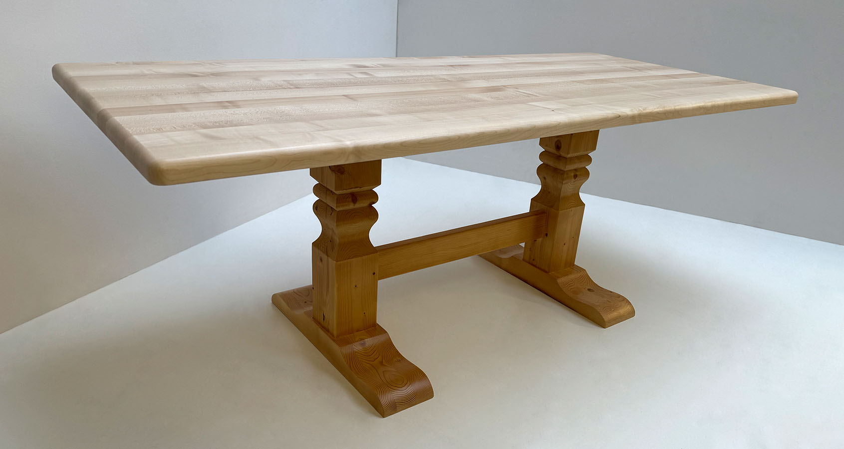 Klostertisch Mittelsäulen-Tisch mit Gefrästen Säulen, 90/180 cm, Ahornplatte massiv
