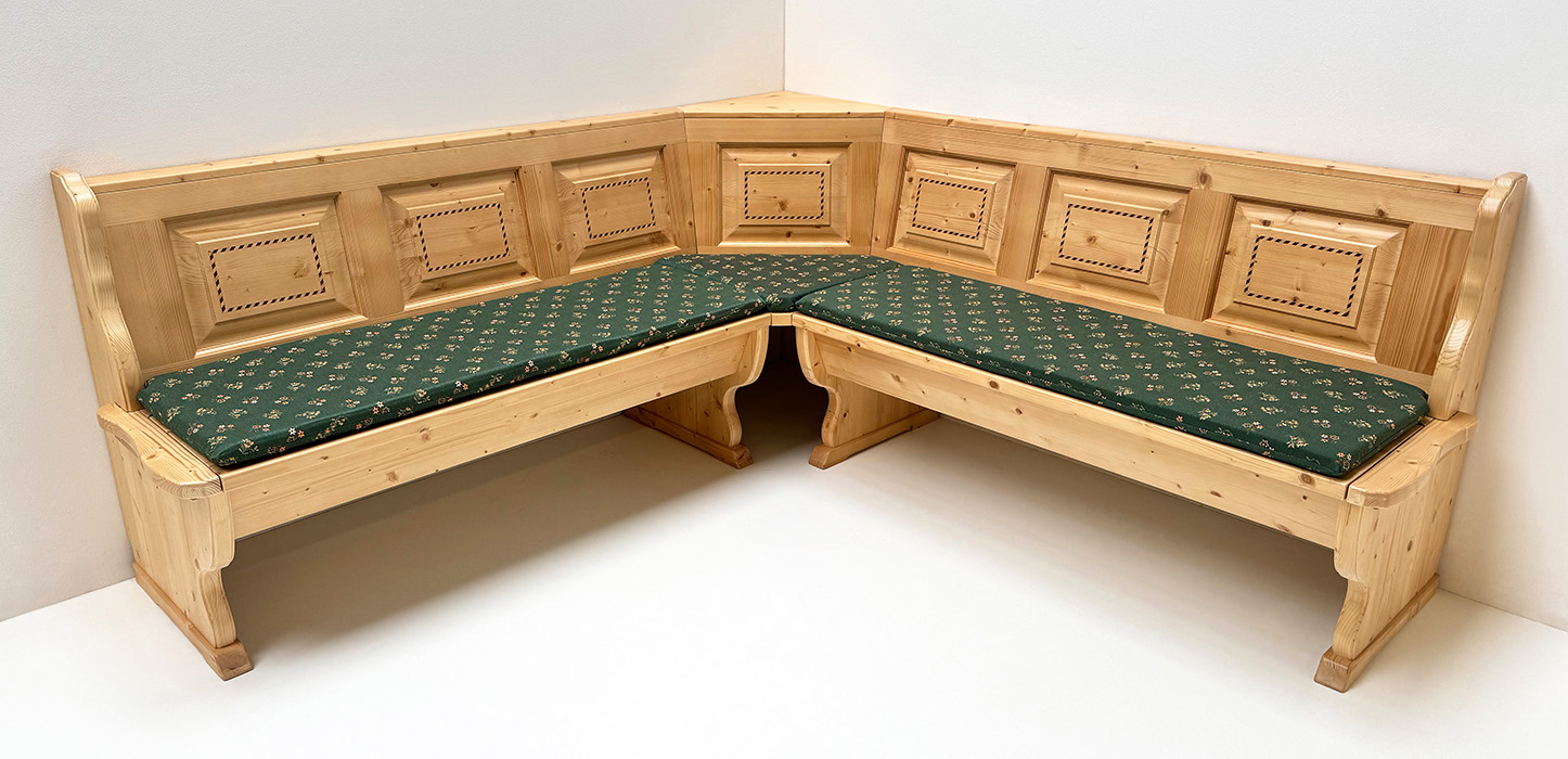 Eckbank Bozen 195/195 cm, Truhen, Kassetten Intarsien, Rosner lackiert, Polster genäht, Kössen grün
