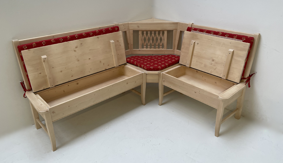 Eckbank Kramsach, 175/140 cm, m. Truhen, Rosner gewachst, Polstersatz genäht, Mülheim Streublume rot