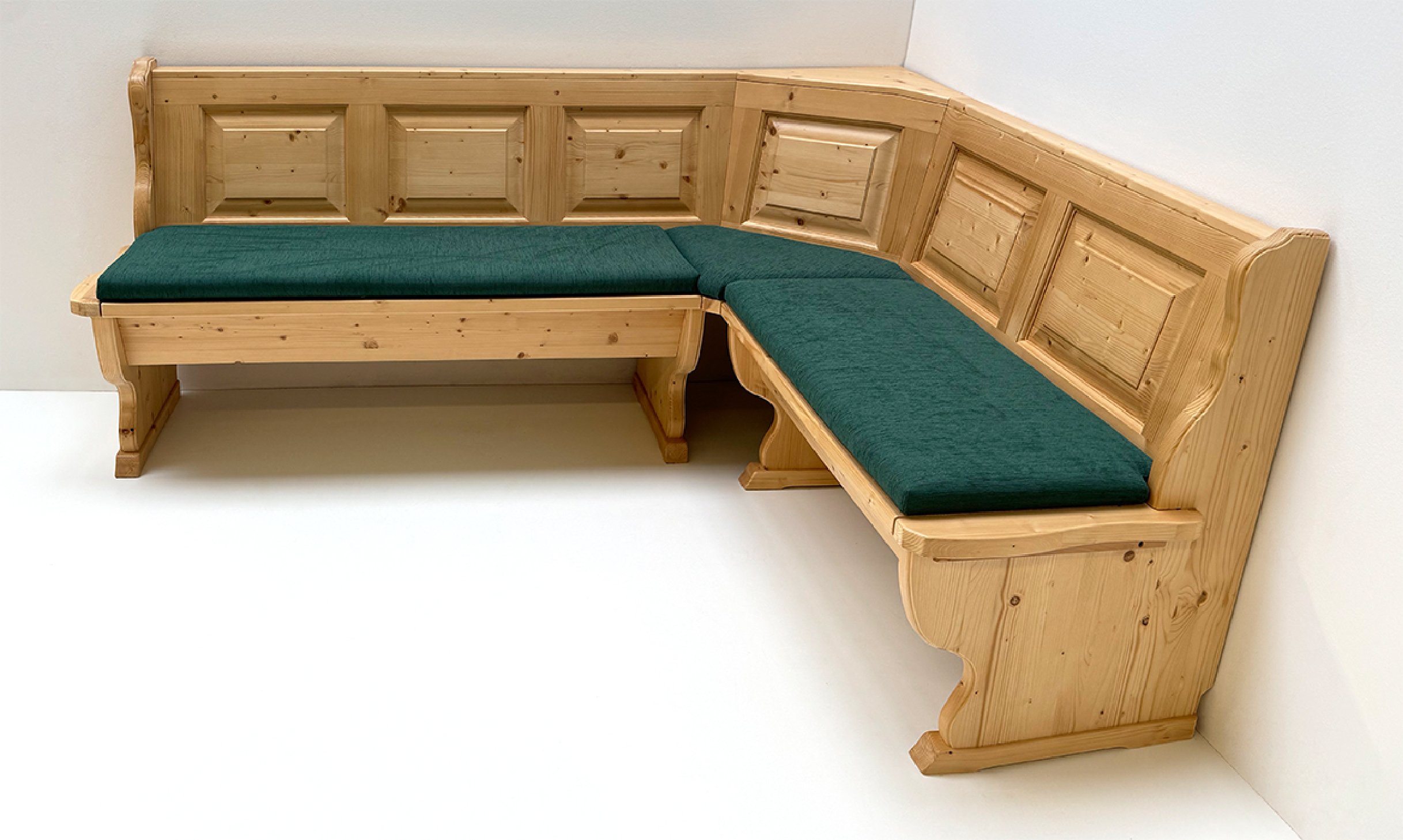 Eckbank Kufstein, 195/165 cm, mit Truhen, Rosner gebeizt und lackiert, Polsterplatte Waidhofen grün