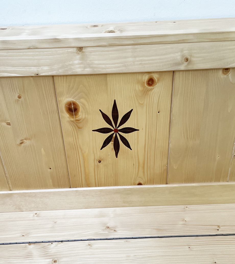 Eckbank Tirol, Sondermaß 140/165 cm, mit Truhen, Intarsien, Fichte Rosner lackiert