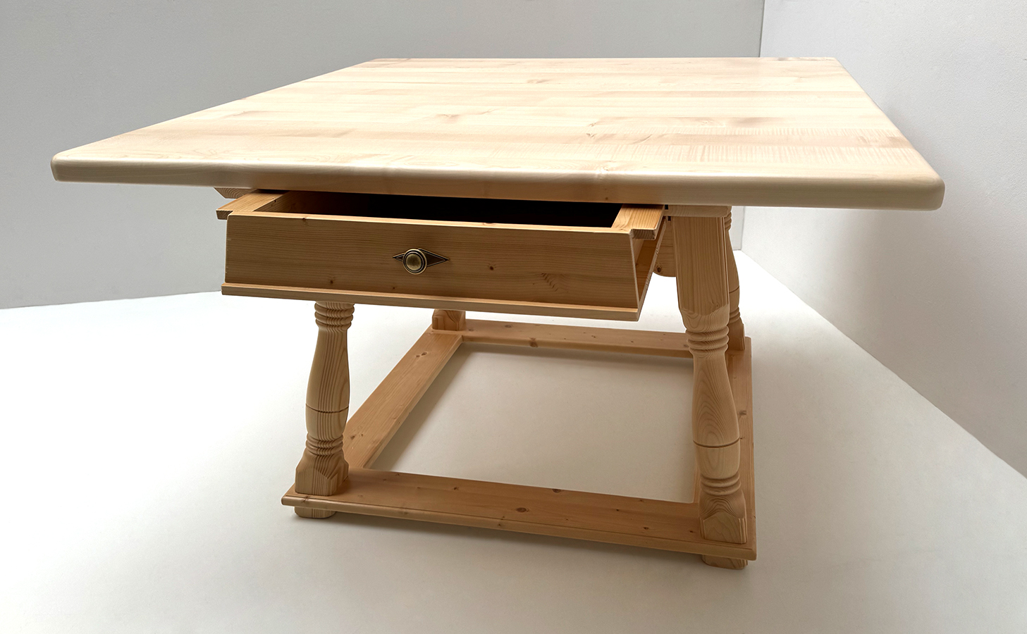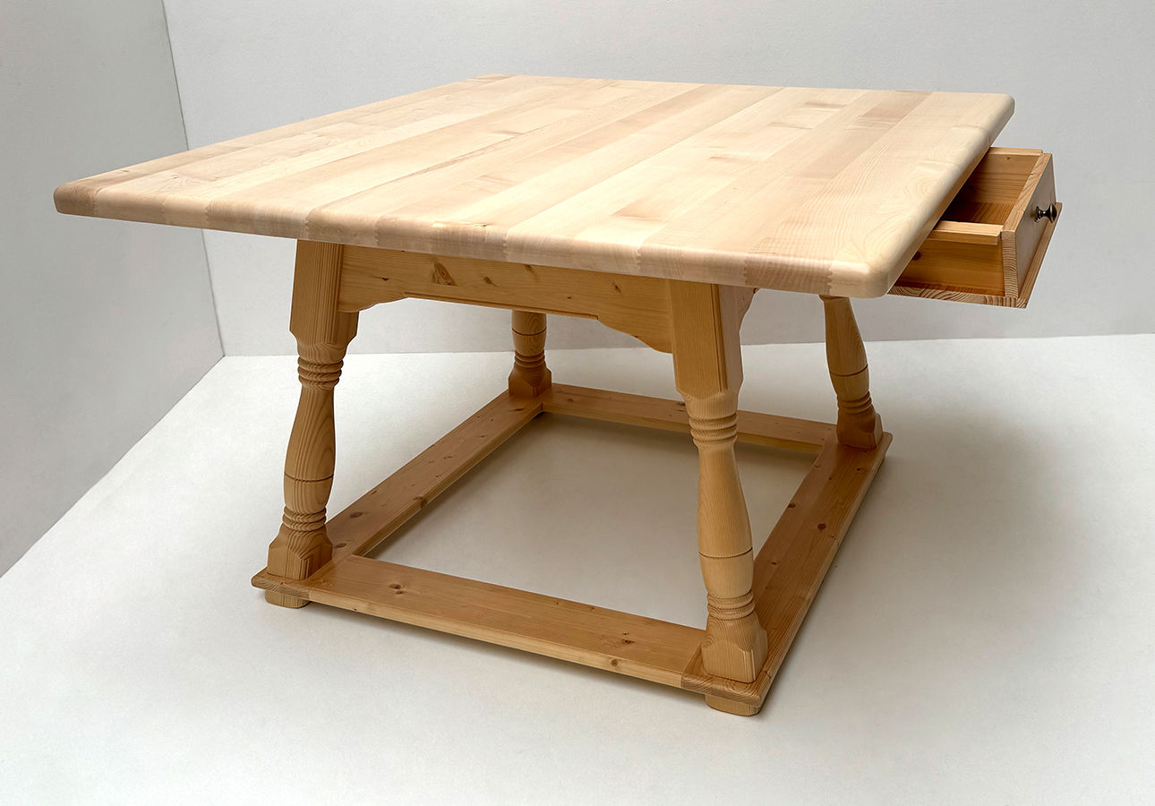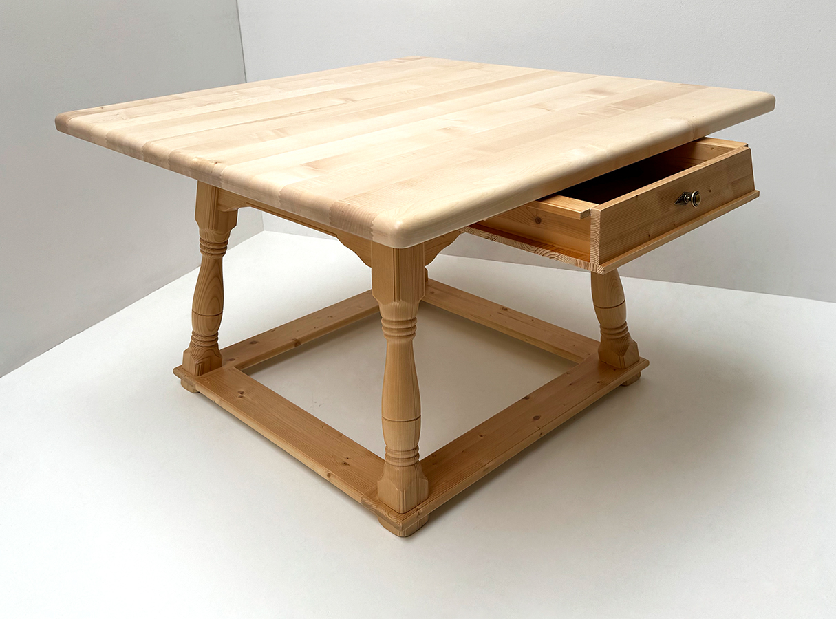 Tisch Bozen 120/120 cm, Schubladen, Gestell Rosner lackiert, massive Ahornplatte 4 cm natur lackiert