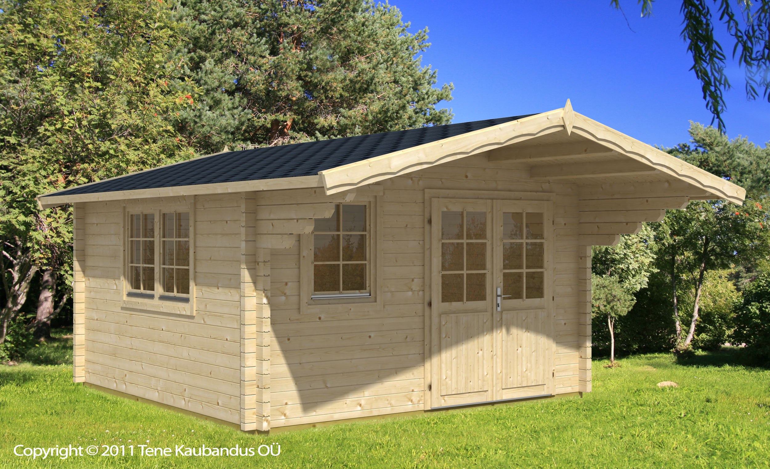 Alle im Werk von Grupotene / Tene Kaubandus hergestellte Gartenhäuser, Blockbohlenhäuser, Schutzdächer, Sommerhäuser und Garagen mit Wandstärken von 58 und 70 mm werden standardgemäß komplettiert (Türen, Fenster, Befestigungsmaterial usw.), weswegen der Aufbau eines Hauses leicht und wenig zeitraubend ist.
