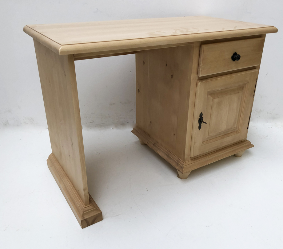 Schreibtisch Mod. Füssen, Wange mit Sockel, 108/76/45 cm (B/H/T), verfügbares Innenmaß: (Minibar) 43/52/46 cm, Fichte massiv, Oberfläche Rosner Hartwachs. Auch in roh, Rosner matt, Lugano, Bassano, Cortina und weiß lackiert möglich.