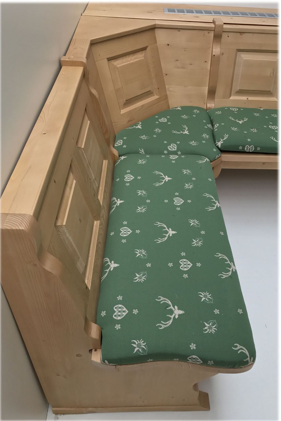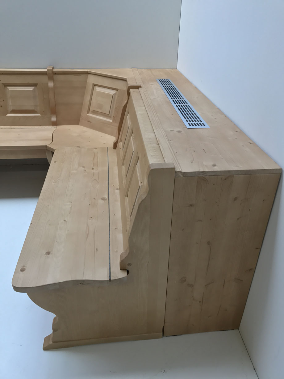 Eckbank 150/185 cm, Gesamthöhe 85 cm, mit Truhen wechselseitig stellbar Alles in Fichte massiv, Rosner gebeizt und gewachst