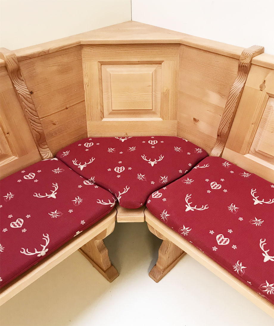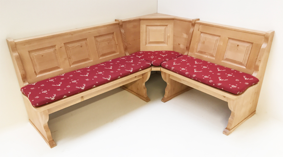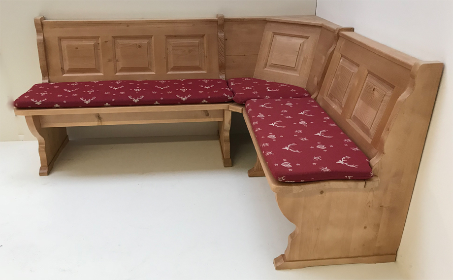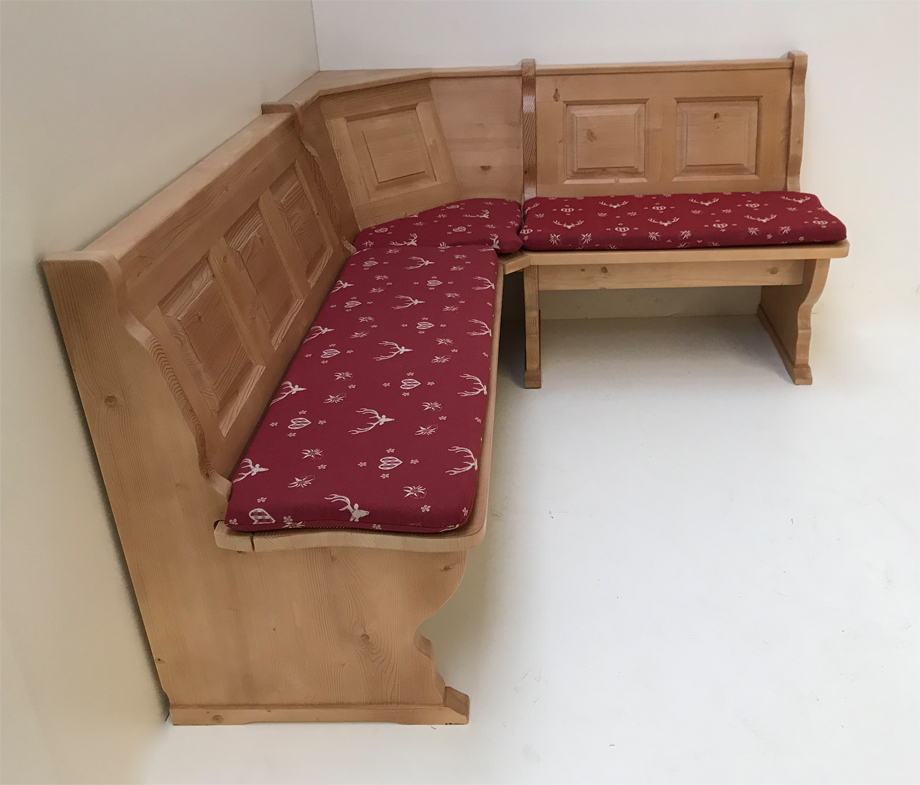 Eckbank 150/185 cm, Gesamthöhe 85 cm, mit Truhen wechselseitig stellbar Alles in Fichte massiv im Sonderton nach Farbpalette Adler Gröden 11456 lackiert