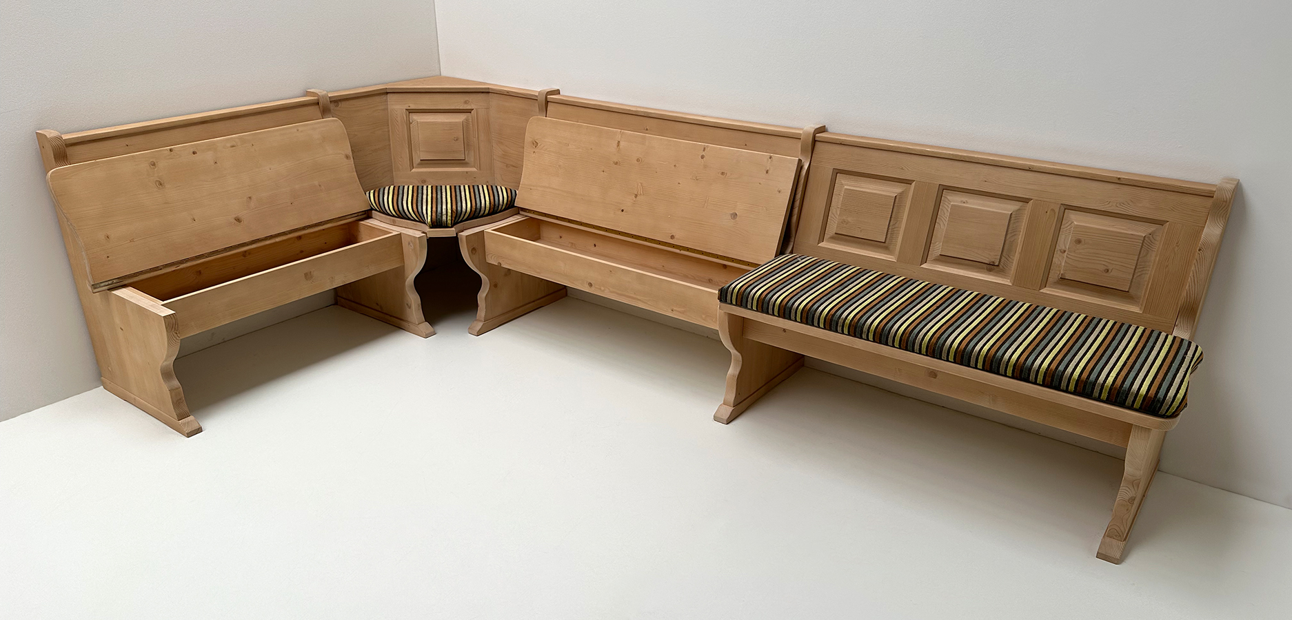 Eckbank System Amberg, 165/300 cm, mit Truhen, als Laufmeterbank mit gleichen Schenkeln, Innenwangen vorstehend, keine durchgehende Ablage !