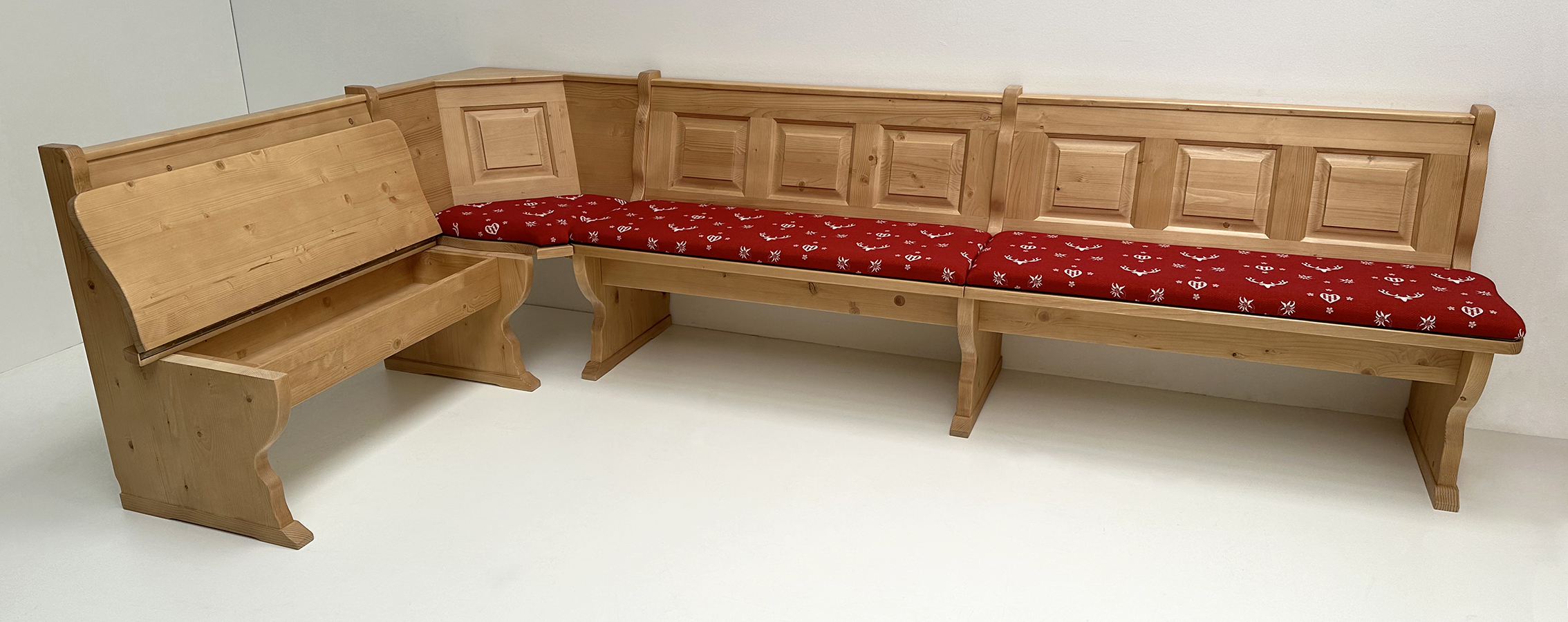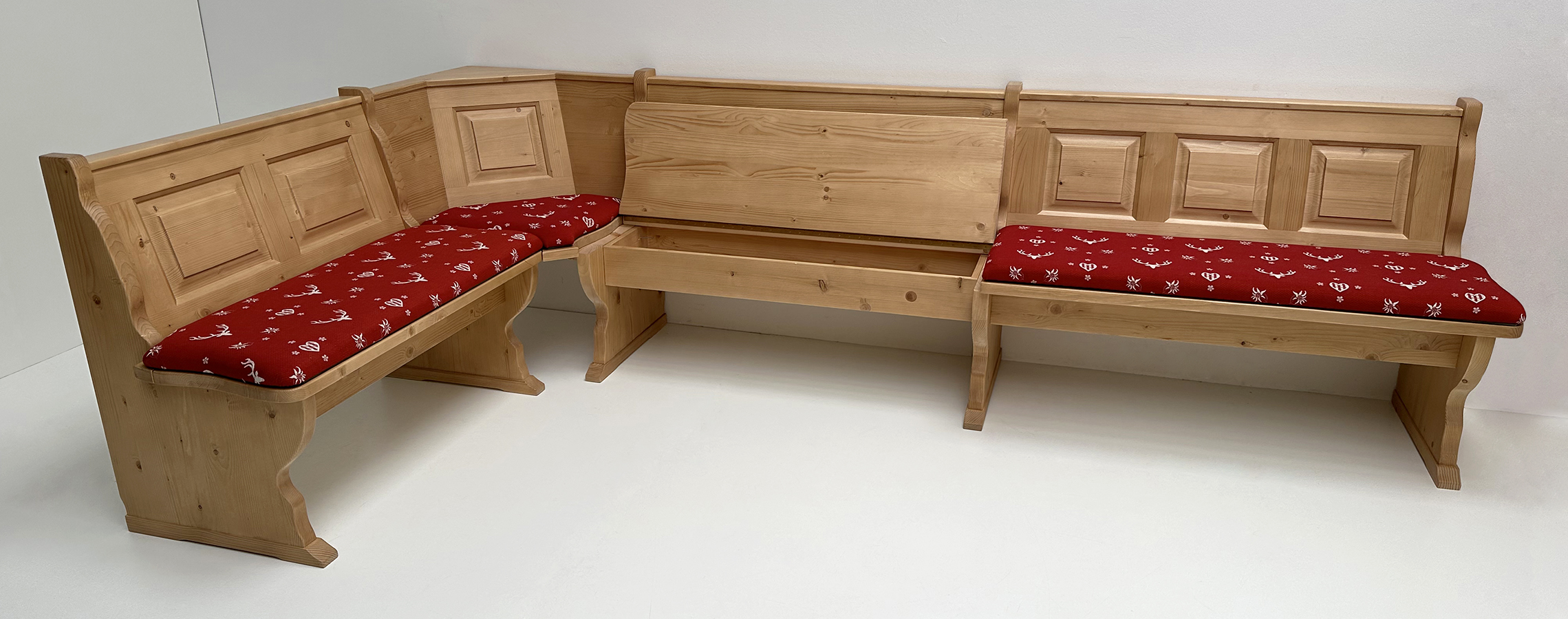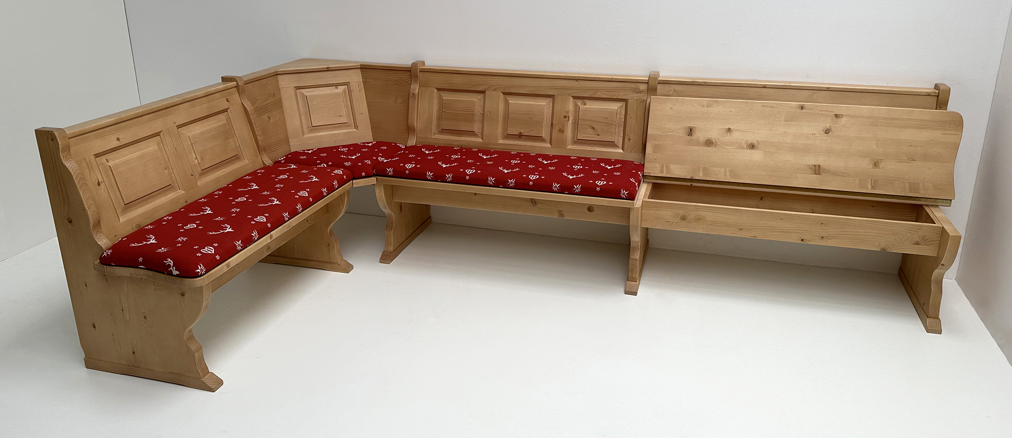 Eckbank System Amberg, 165/300 cm, mit Truhen, als Laufmeterbank mit gleichen Schenkeln, Innenwangen vorstehend, keine durchgehende Ablage !