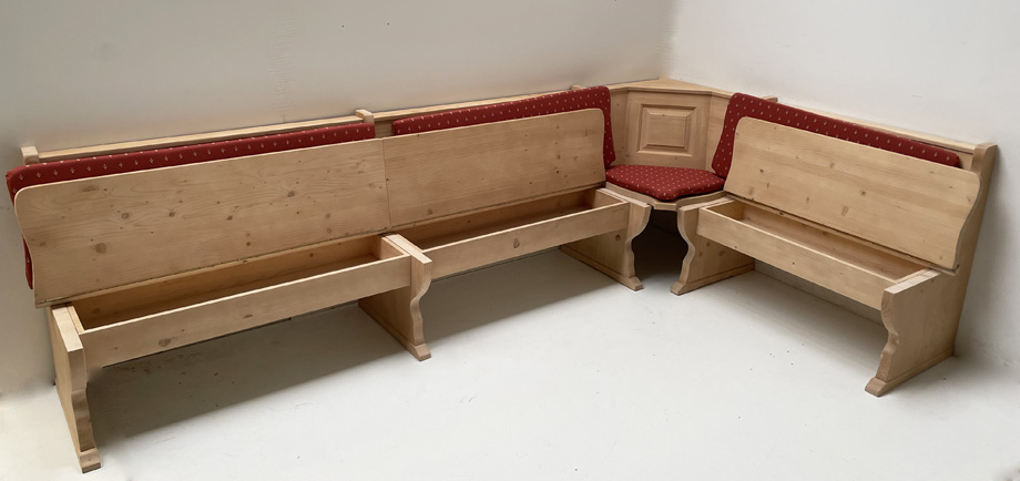 Eckbank System Amberg, 300/165 cm, mit Truhen, als Laufmeterbank mit gleichen Schenkeln, Innenwangen vorstehend , keine durchgehende Ablage !