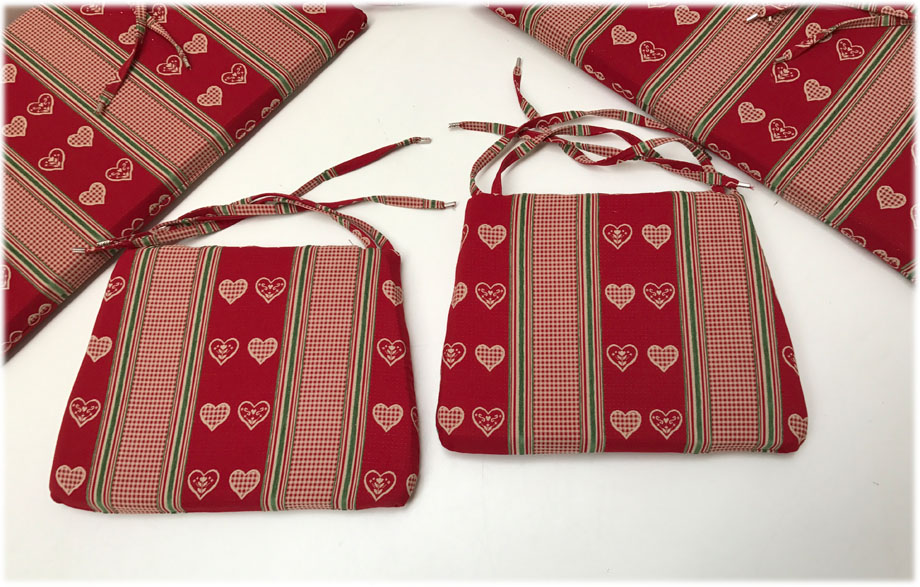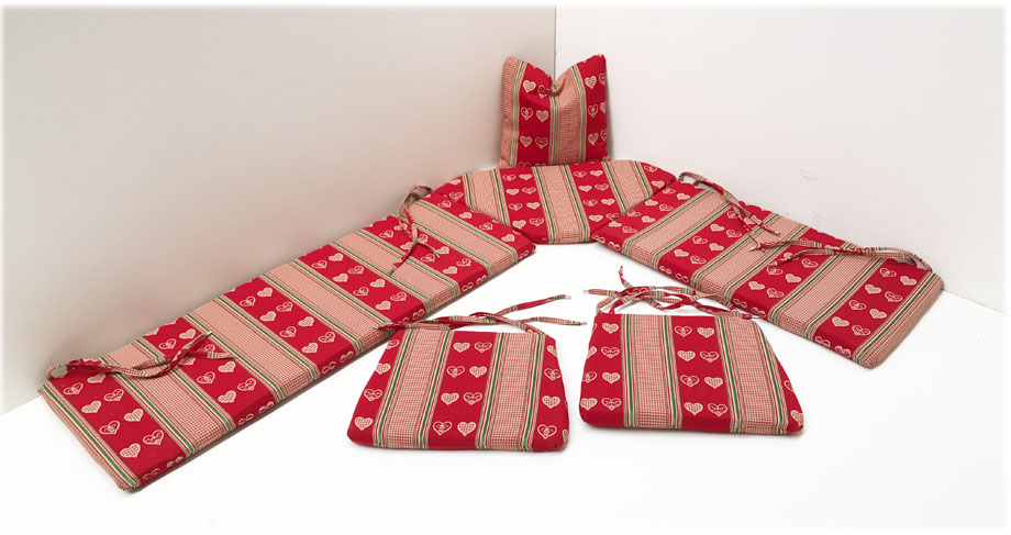 Polstersatz lose genäht für Eckbankgruppe Rangau 150/190 cm, inkl. 1 Sofa Kissen 40/40 cm gratis !! Alles in Ausführung lose genäht mit Reissverschlüßen zum Abziehen und Bänder an den Stuhlkissen zum Anbinden ! Stabile fest eingenähte Bänder aus dem gleichen Möbelstoff, Enden der Bänder gekrimpt ! Gegen Verrutschen mit Antirutschunterlage ! Stoff Perle Landhaus Träume, Osttirol 50; Auslaufstoff, nicht mehr bestellbar !