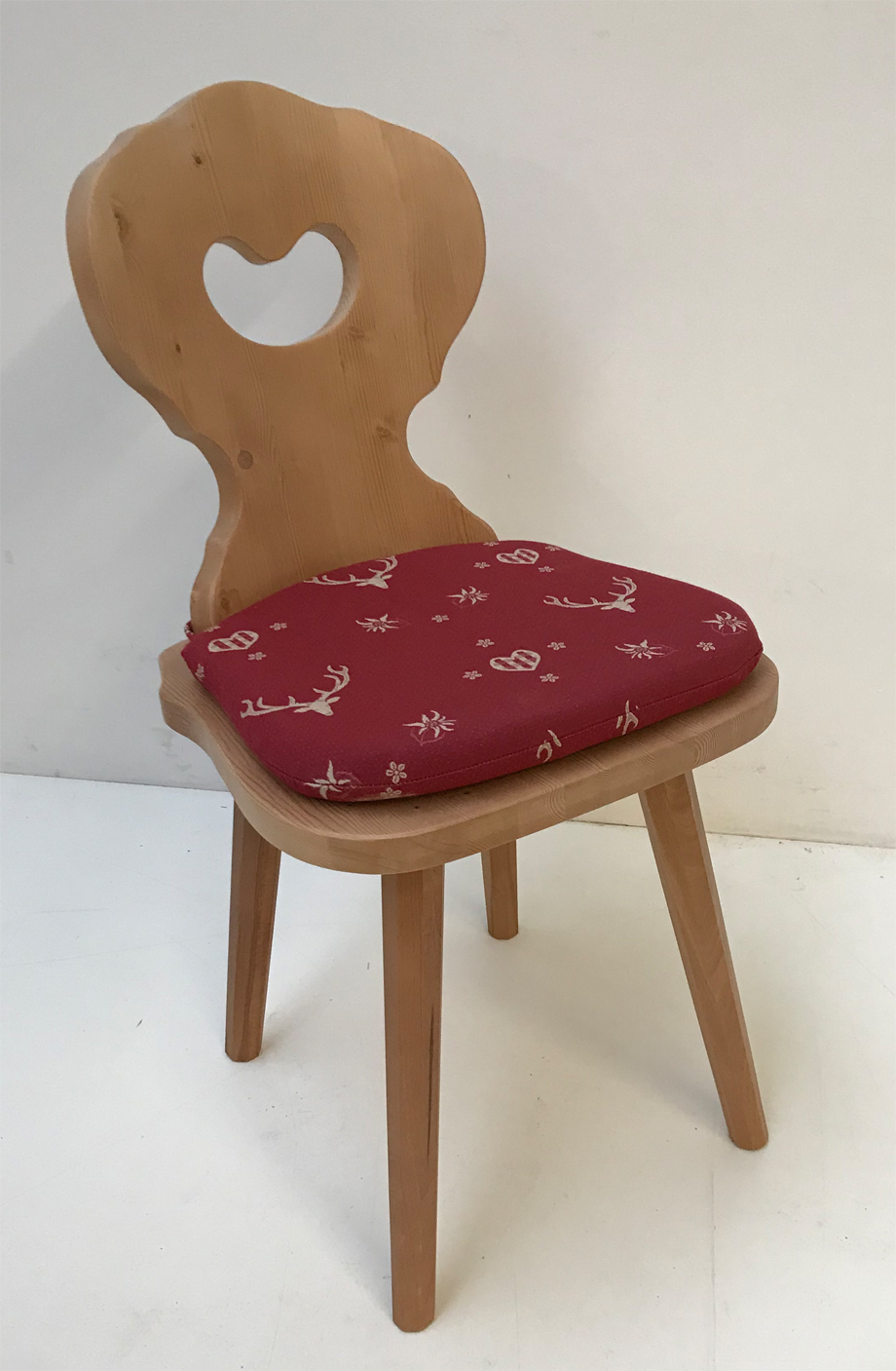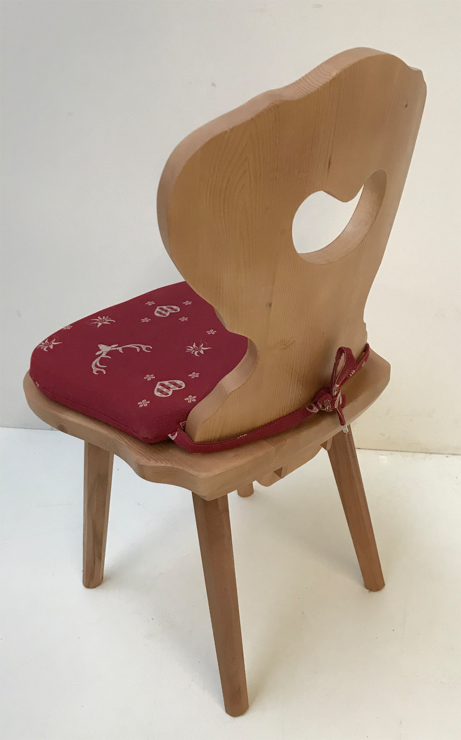 mit Stuhlkissen für Bauernstuhl Amberg, Ausführung lose genäht mit Reissverschluß zum Abziehen und Bänder zum Anbinden! Fest eingenähte Bänder aus dem gleichen Möbelstoff, Enden der Bänder gekrimpt ! Gegen Verrutschen mit Antirutschunterlage !