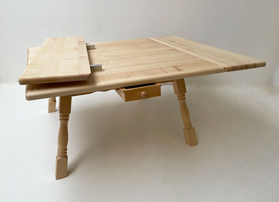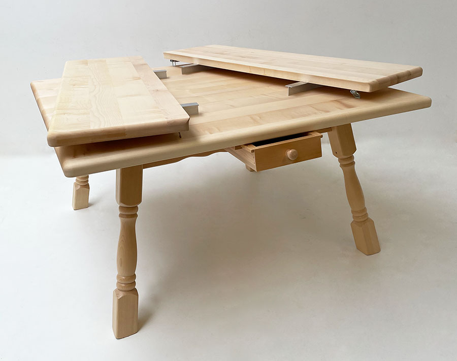 Vierfußtisch 4510 Amberg DT, mit Schubladen, Ahornplatte 140/140 cm, 2 Ansteckplatten 40 cm, geölt