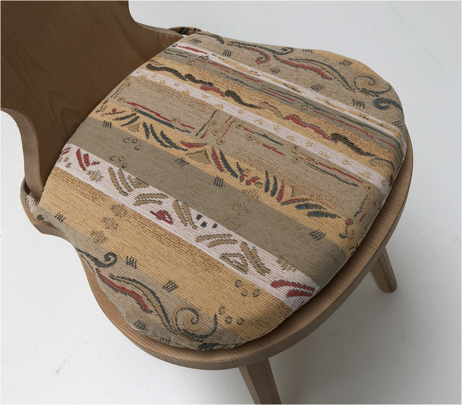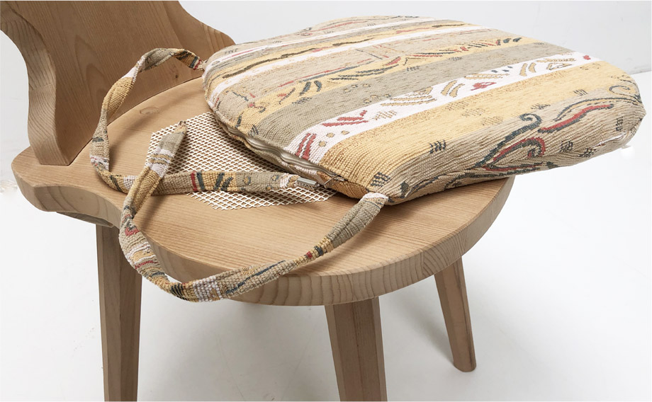 1 Stuhlkissen, Ausführung lose genäht mit Reissverschluß zum Abziehen und Bänder zum Anbinden! Fest eingenähte Bänder aus dem gleichen Möbelstoff, Enden der Bänder gekrimpt ! Gegen Verrutschen mit Antirutschunterlage !