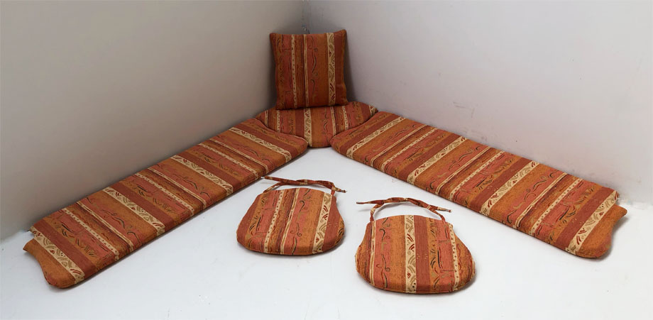 Polstersatz lose genäht für Eckbankgruppe Landau , inkl. 1 Sofa Kissen 40/40 cm gratis !!  Alles in Ausführung lose genäht mit Reissverschlüßen zum Abziehen und Bänder an den Stuhlkissen zum Anbinden ! Stabile fest eingenähte Bänder aus dem gleichen Möbelstoff, Enden der Bänder gekrimpt ! Gegen Verrutschen mit Antirutschunterlage !