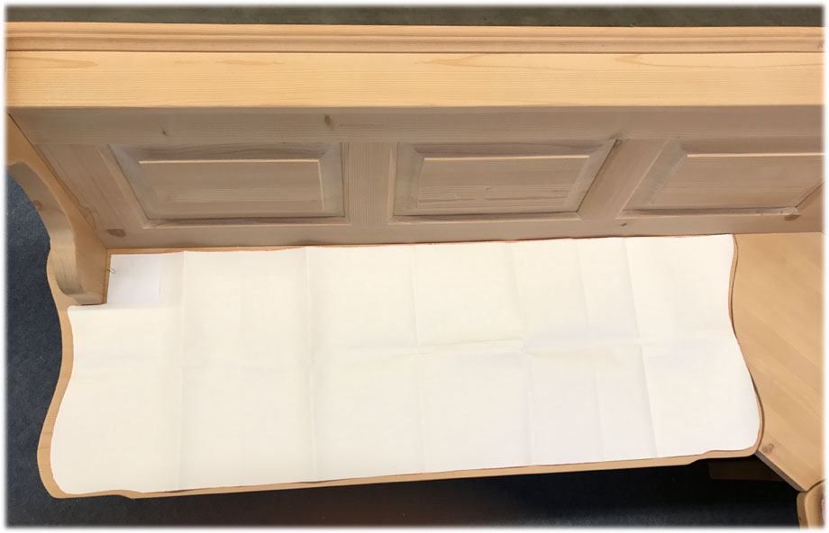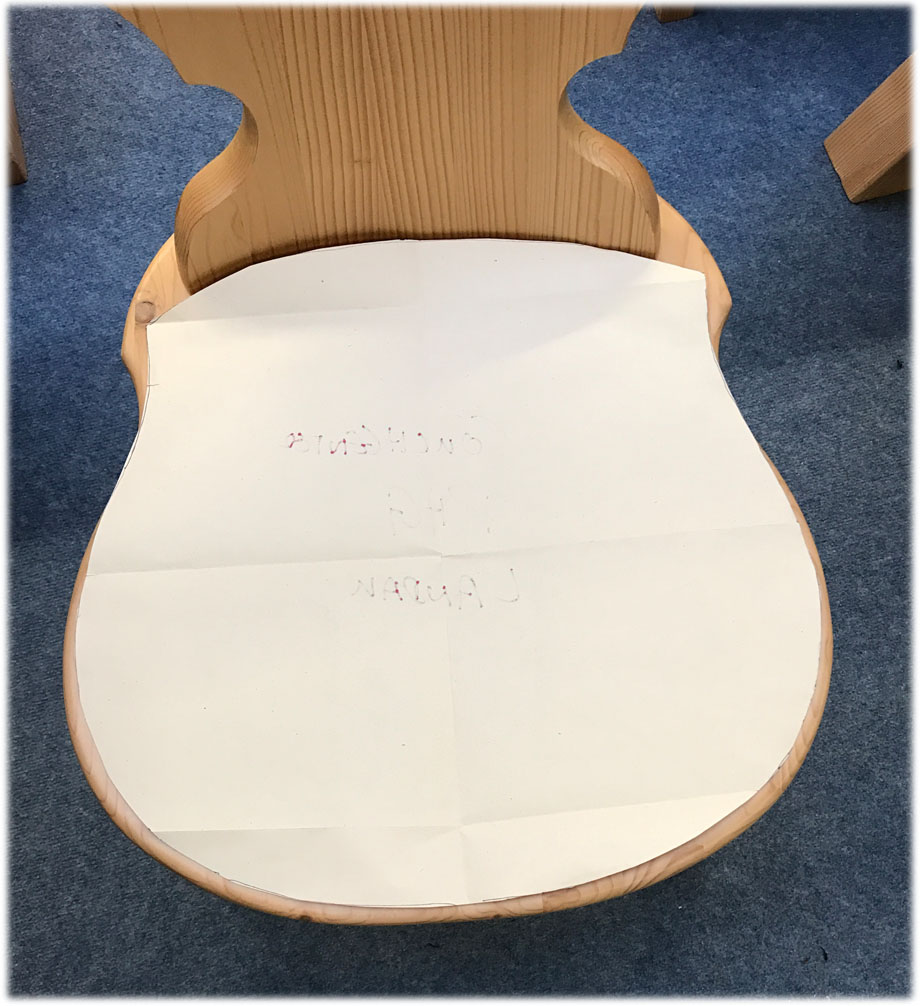 Die Größe der Schablone wählen Sie vorne etwas kleiner als der Banksitz damit die Scheuerkante vorne etwas zurückspringt (ca. 1 cm).