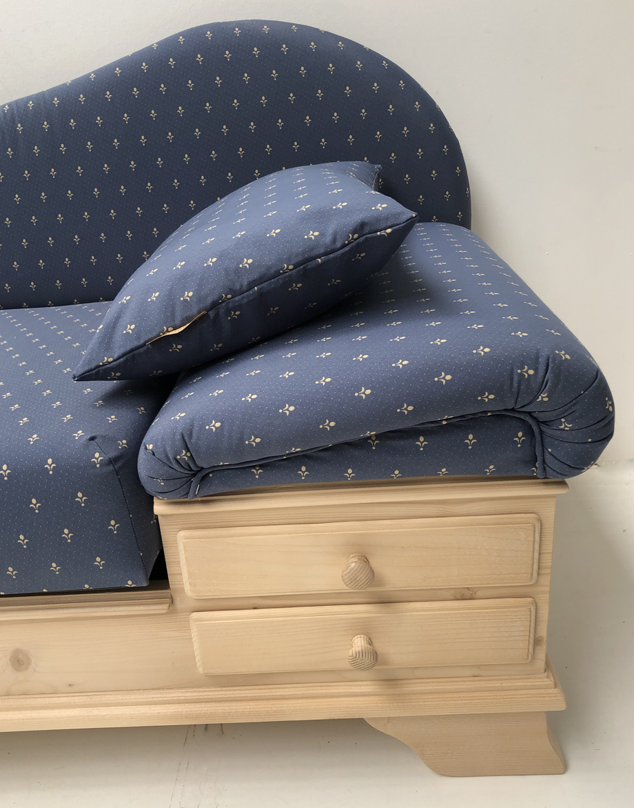Kopfteil rechts, hier im Stoff KUNDL blau, 222051-61 47% Polyester, 53% Polyacryl, 32.000 Scheuertouren, 144 cm Breite, 345 g/m², 4,2 cm Rapport, Abm: 195/75/86 cm, (L/T/H), Sitzhöhe 45 cm, Polsterung Komfort Kaltschaum, Kopfteil höhenverstellbar, Sitz mit Klappfunktion, Holzteile: Fichte,