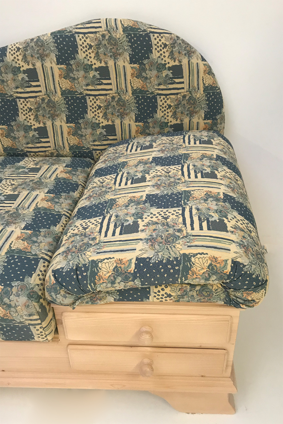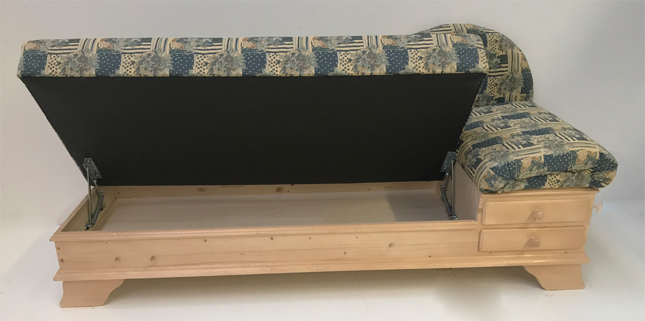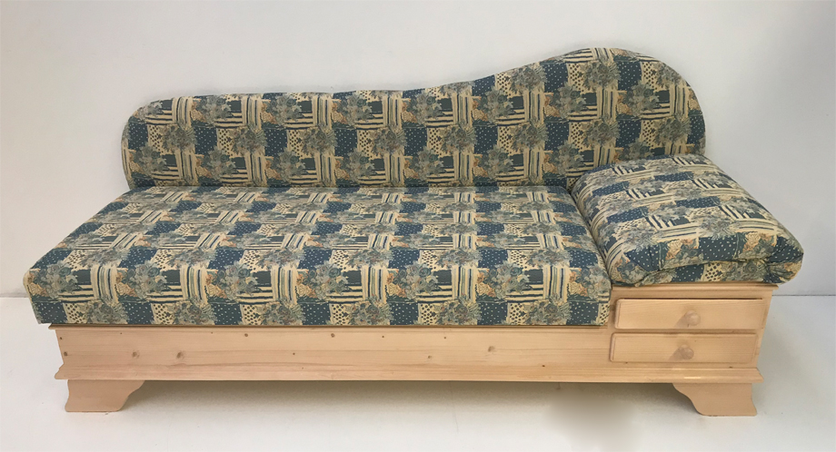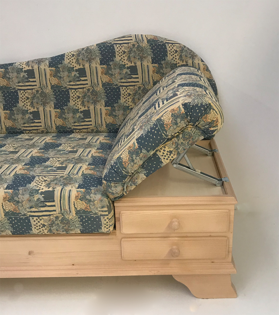 Abm: 195/76/79 cm, (L/T/H), Sitzhöhe 46 cm, Polsterung Komfort Kaltschaum, Kopfteil höhenverstellbar, Sitz mit Klappfunktion, Holzteile: Fichte gewachst