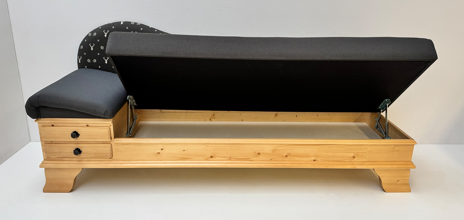 Sonderlänge 220 cm, Sitzhöhe erhöht auf 50 cm , Sitz aufklappbar, Kopfteil im Raster