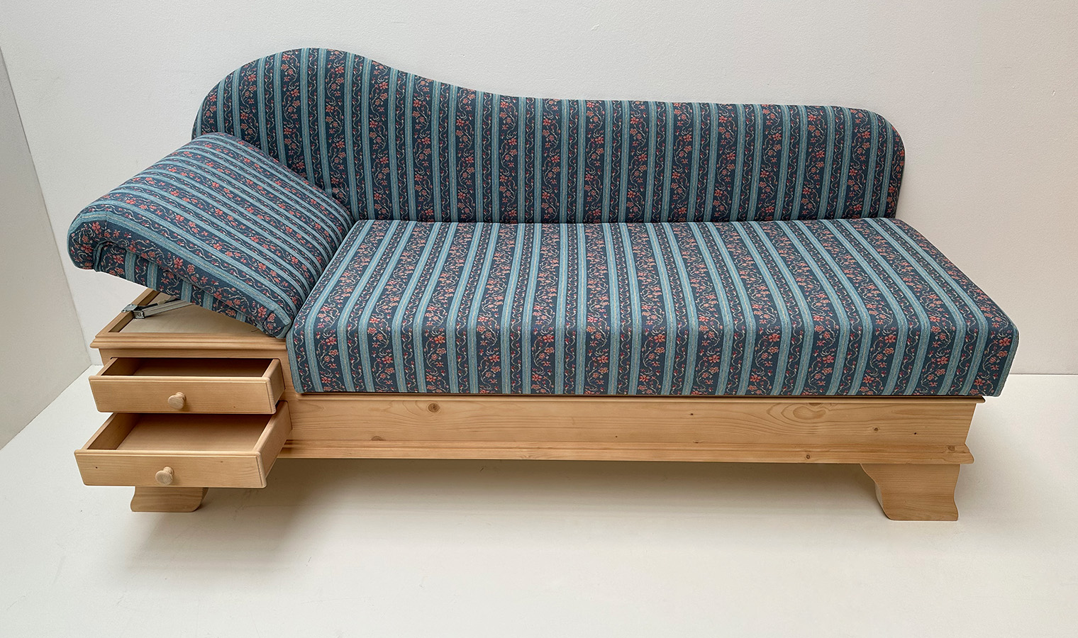 Abm: 195/75/86 cm, (L/T/H), Sitzhöhe 45 cm, Polsterung Komfort Kaltschaum, Kopfteil höhenverstellbar, Sitz mit Klappfunktion, Holzteile: Fichte, gewachst