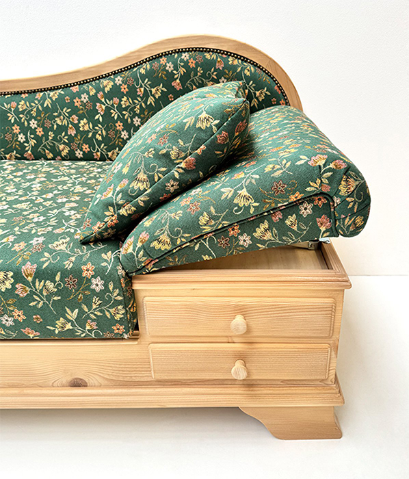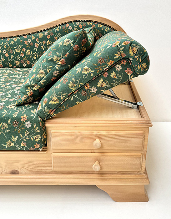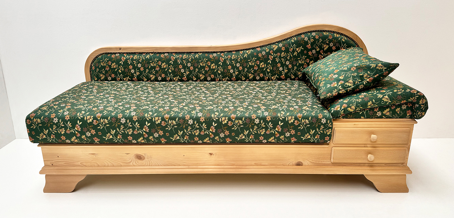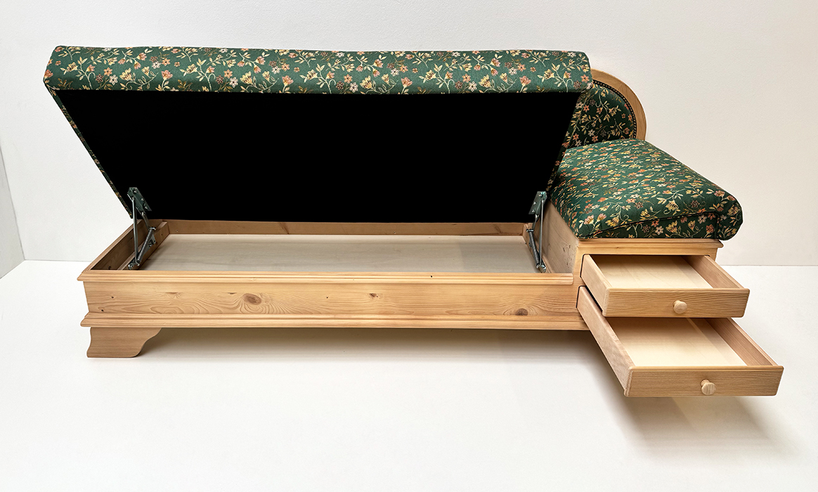 Liege Garmisch, Abm: 195/75/86 cm, (L/T/H), Sitzhöhe 45 cm, Polsterung Komfort Kaltschaum, Kopfteil höhenverstellbar, Sitz mit Klappfunktion, 2 große Schubladen, mit Holzknopf