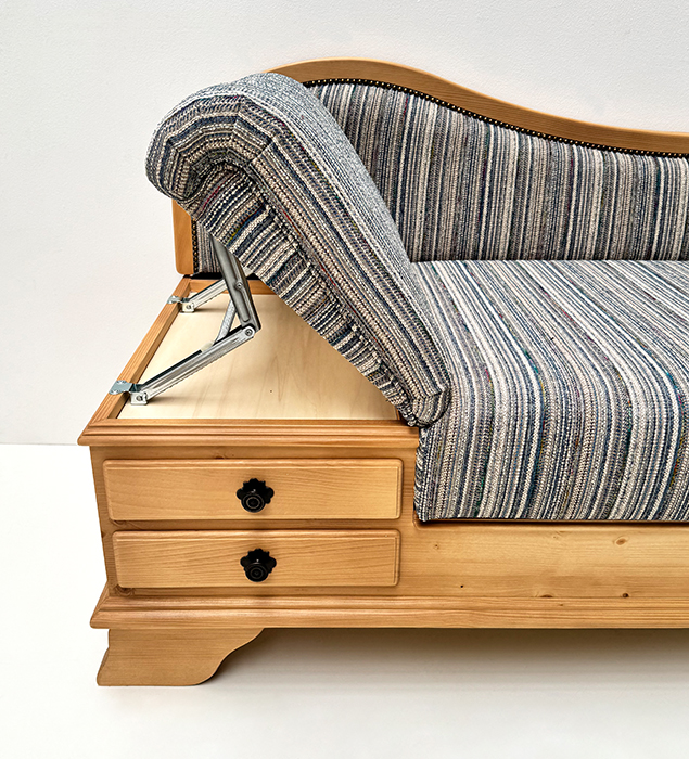 Sitz aufklappbar, Kopfteil im Raster verstellbar, 2 große Schubladen, inkl. 1 Kissen 40/60 cm, mit Federfüllung