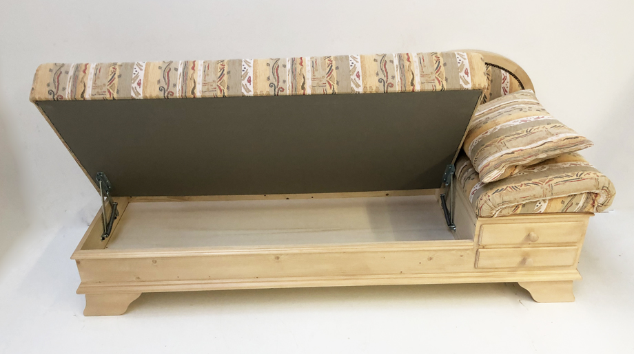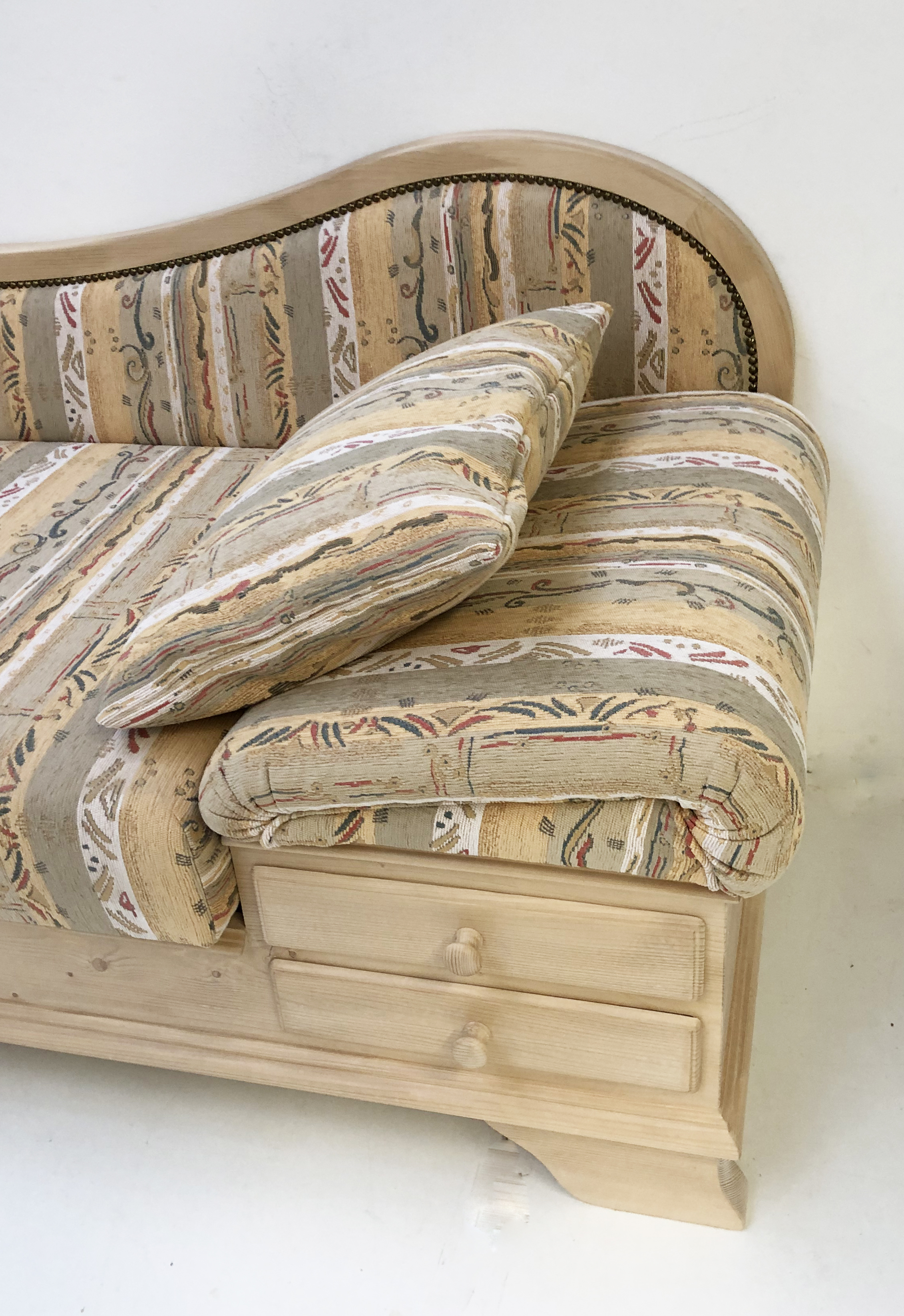 Abm: 195/75/86 cm, (L/T/H), Sitzhöhe 45 cm, Polsterung Komfort Kaltschaum, Kopfteil höhenverstellbar, Sitz mit Klappfunktion, Holzteile: Fichte,