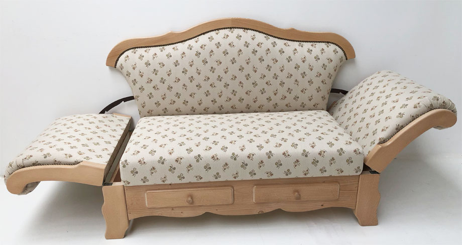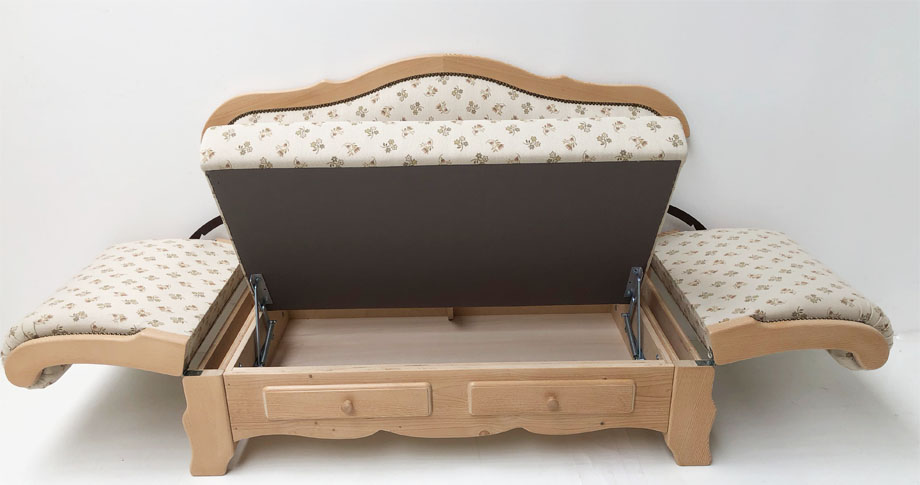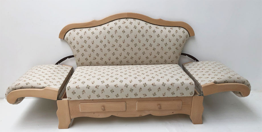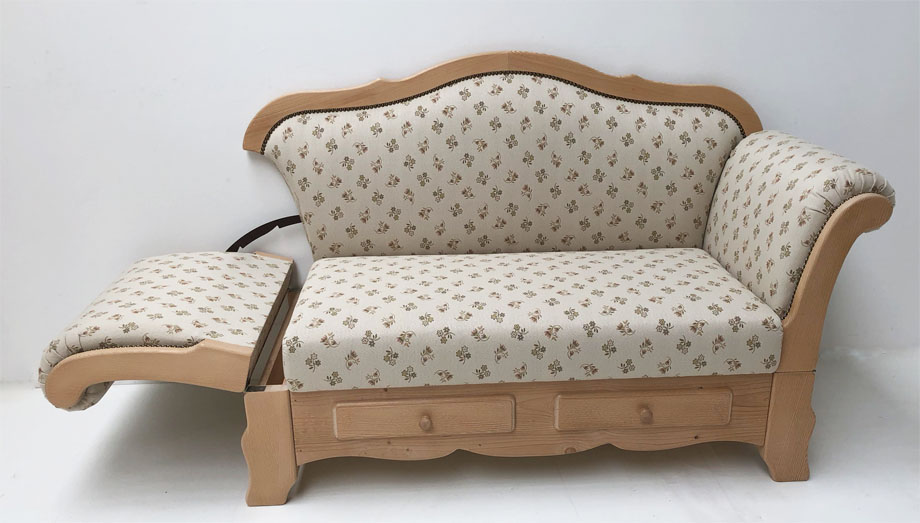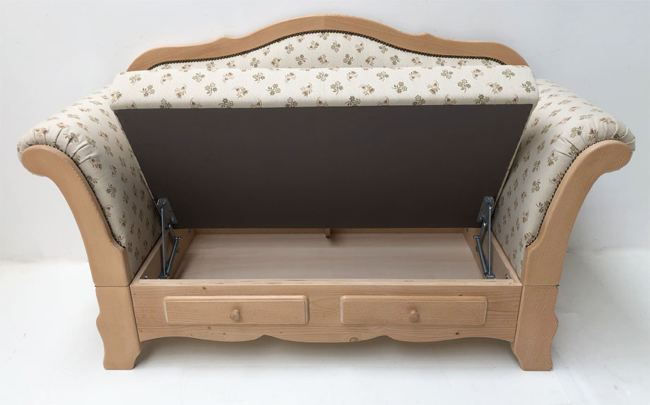 Holz Fichte massiv, Rosner gewachst, Angebotsstoffe: 1 Sofa Kempten ,Länge 160, Sitz 110 cm, Rücken Holzrahmen, Sitz aufklappbar, Schubladenblenden,