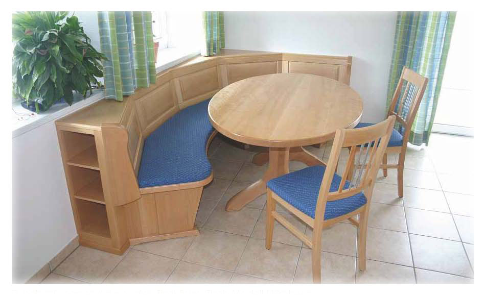 1 Rundbank in einer 90° Wandecke links 2600 x rechts 1500 mm in gedämpfter Buche massiv. Wangenuntergestell in Form 3, Sitzfläche
