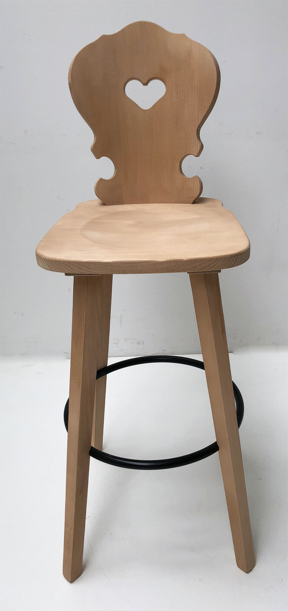 Abm. 48 x 52 x 119 cm, B/T/H , Sitzhöhe 80 cm, Sprossenhöhe Fußkranz Metall 33 cm, Lehne mit Herz, Fichte massiv, gewachst, SP5, Sitz mit gefräster Kehlung