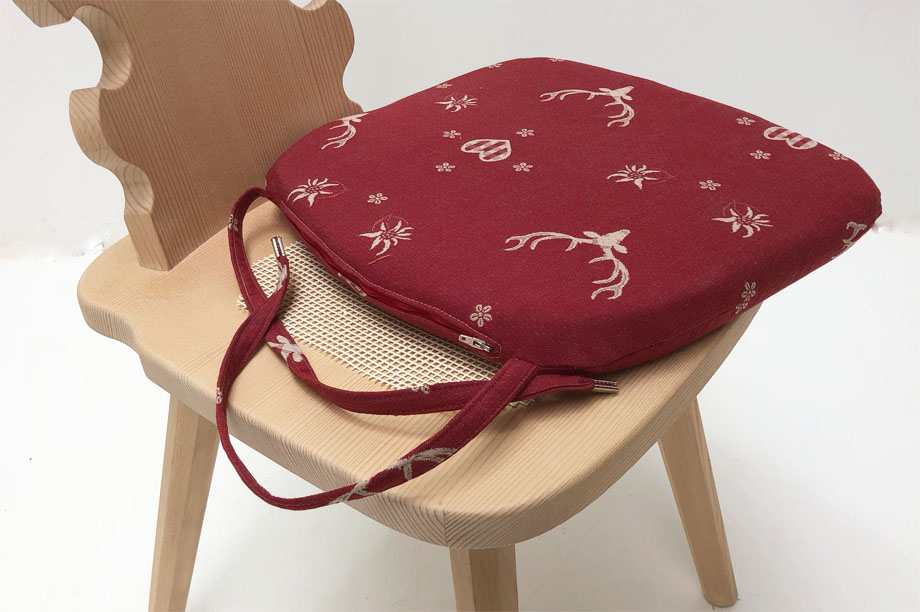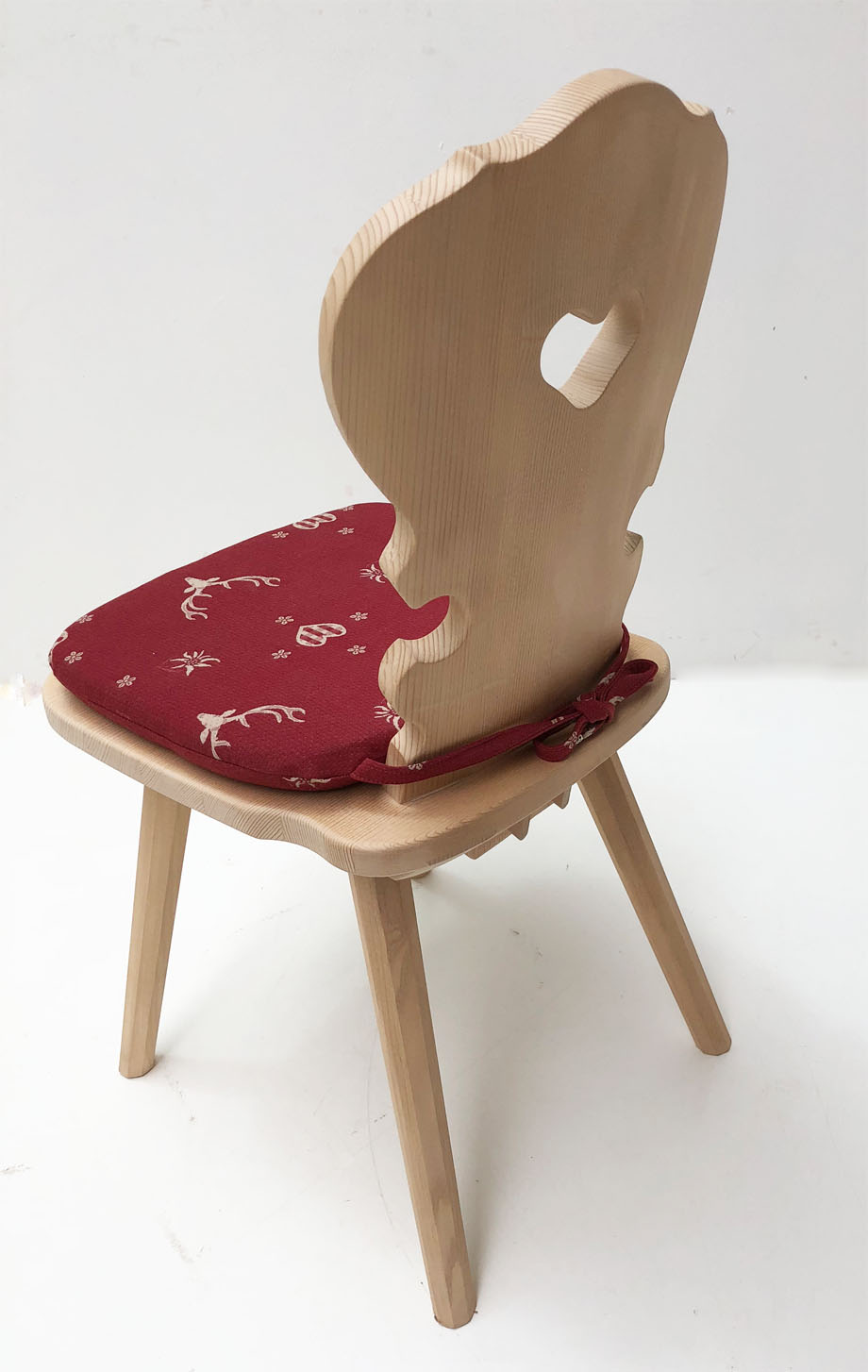 mit Stuhlkissen für Bauernstuhl Garmisch , Ausführung lose genäht mit Reissverschluß zum Abziehen und Bänder zum Anbinden! Fest eingenähte Bänder aus dem gleichen Möbelstoff, Enden der Bänder gekrimpt ! Gegen Verrutschen mit Antirutschunterlage !