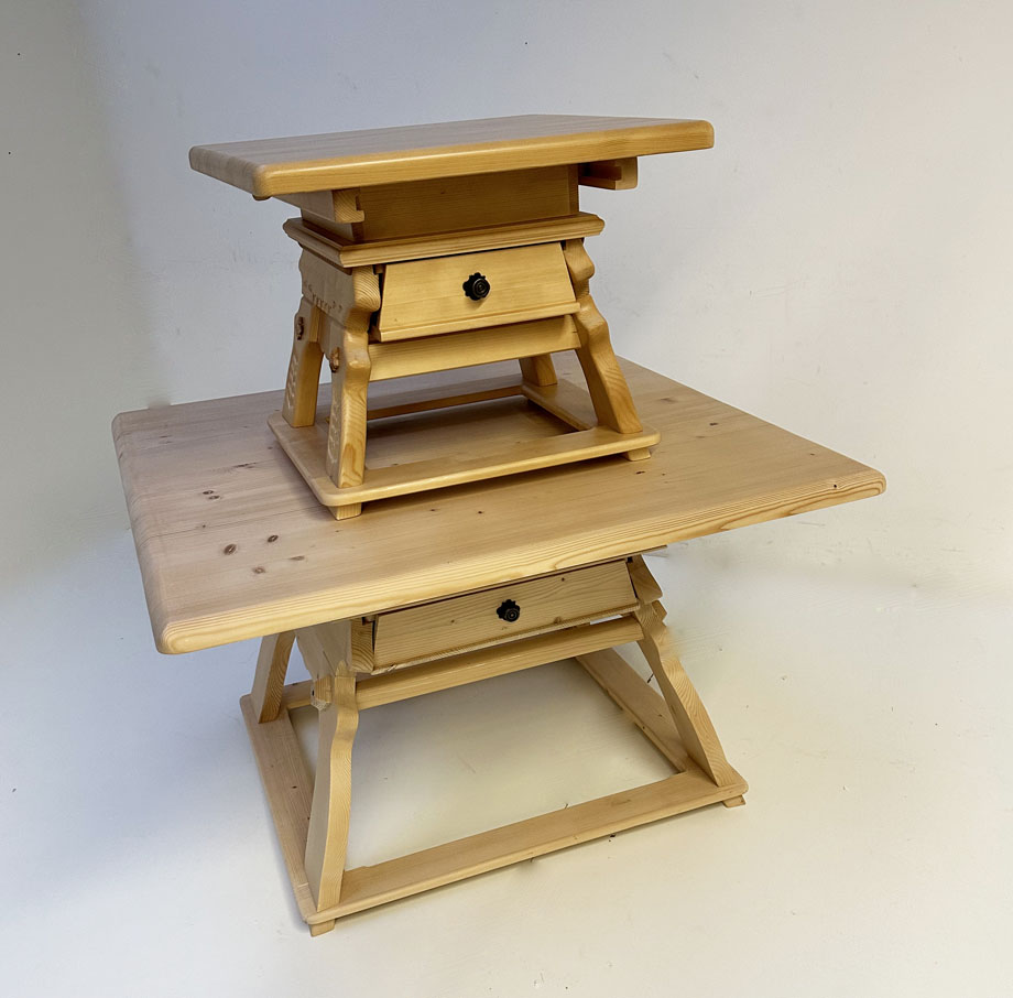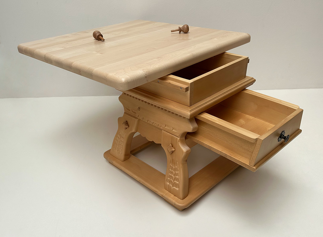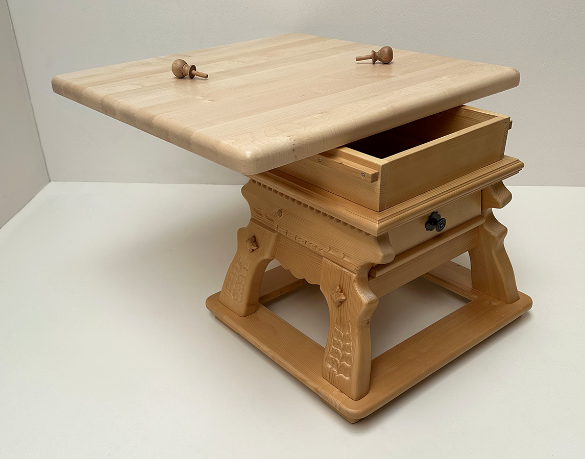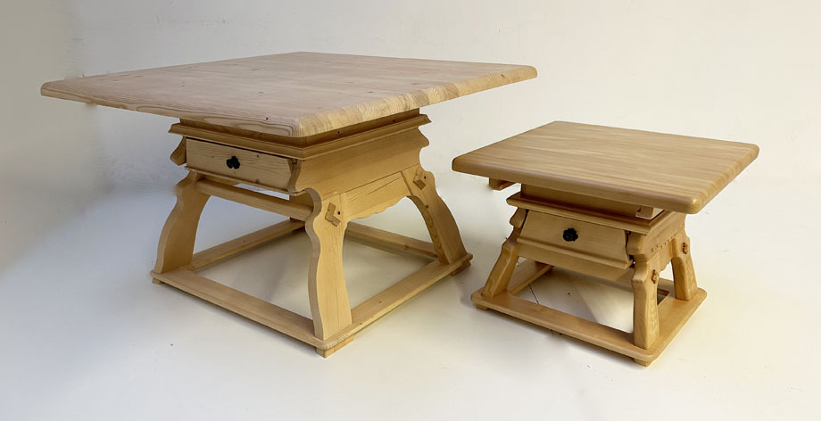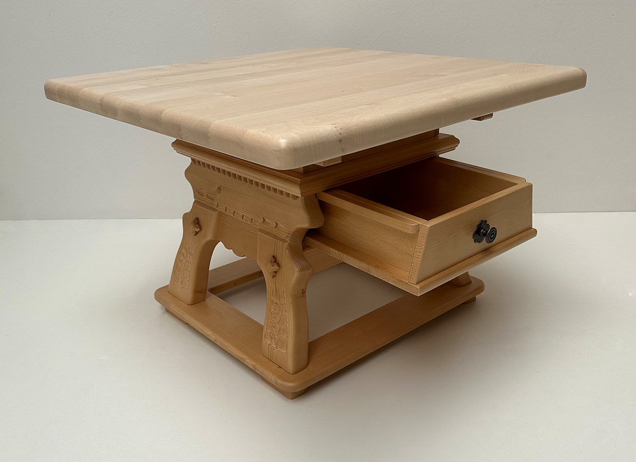 Unser Couchtisch Landau mit Schubladen, Fichteplatte verschiebbar, 80/80 cm, Höhe 54 cm, Platte massiv, 4 cm stark, geschnitzte Wangen
