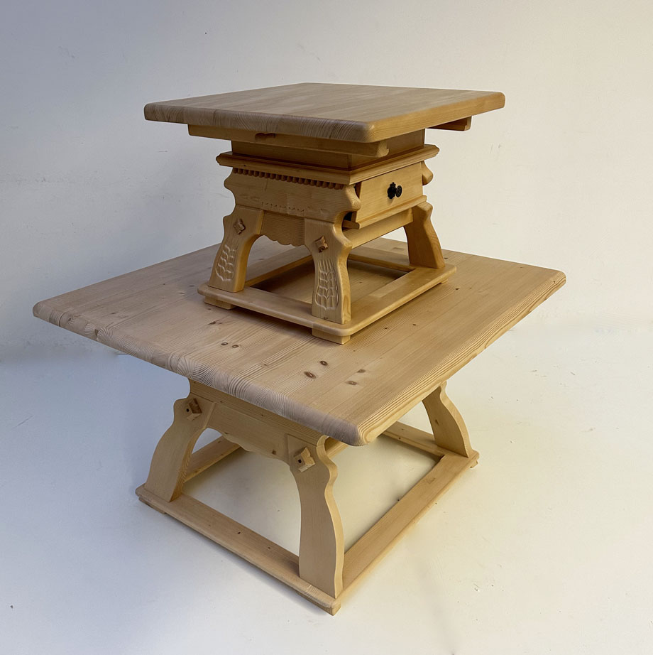 Jogl-Tisch Landau 120/120 mit Schubladen, ungeschnitzt, Rosner gewachst