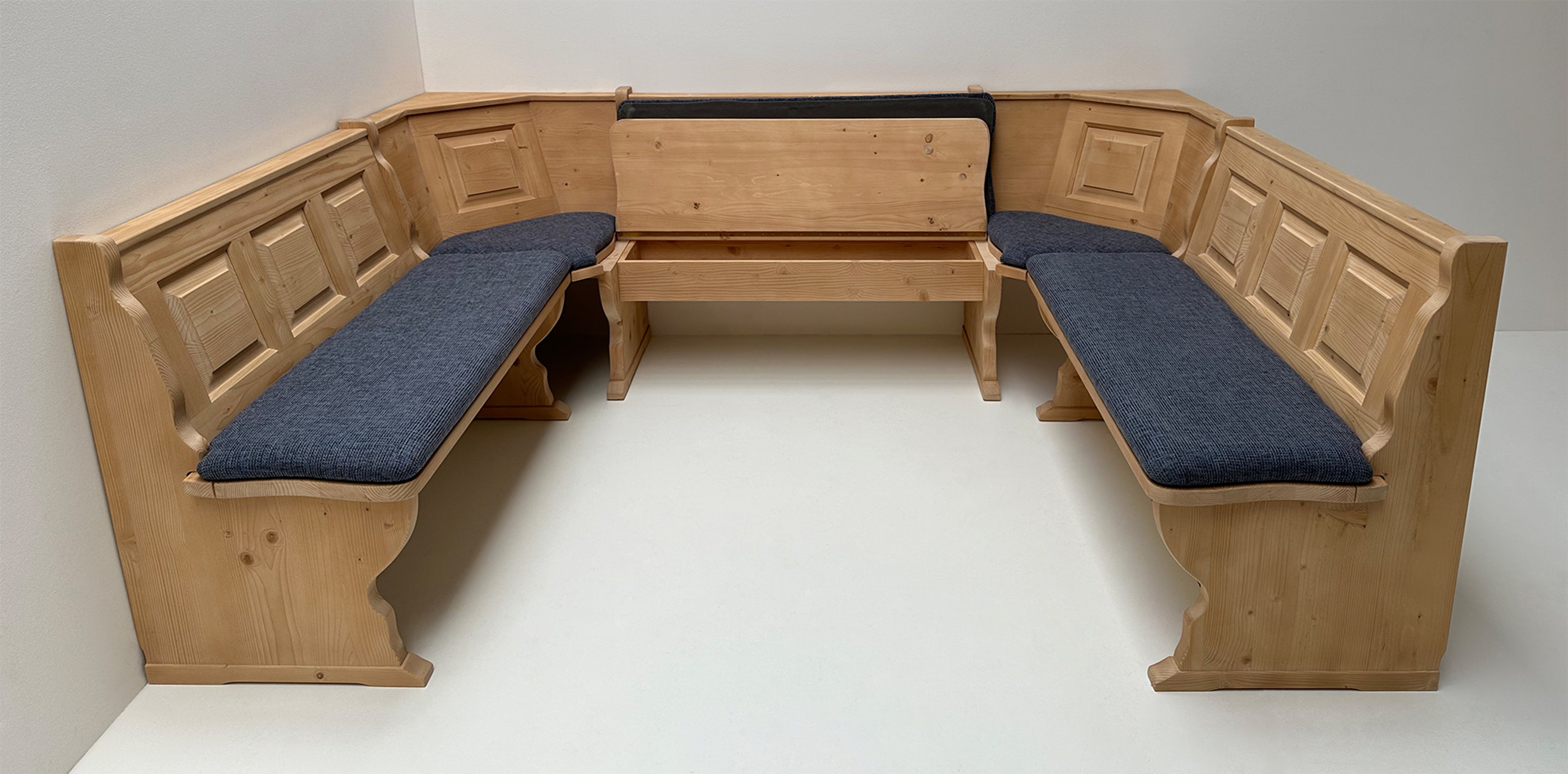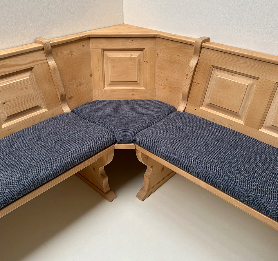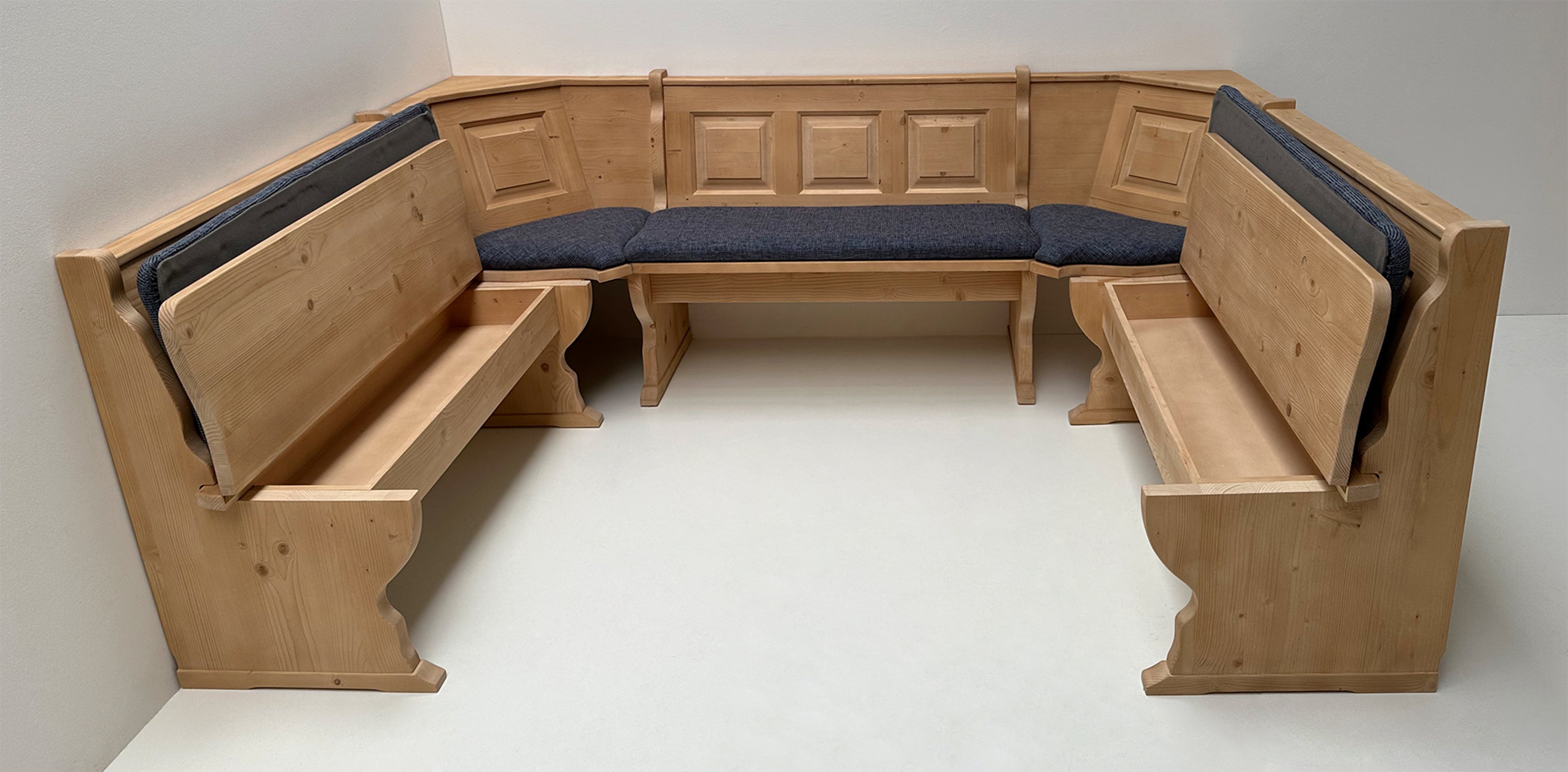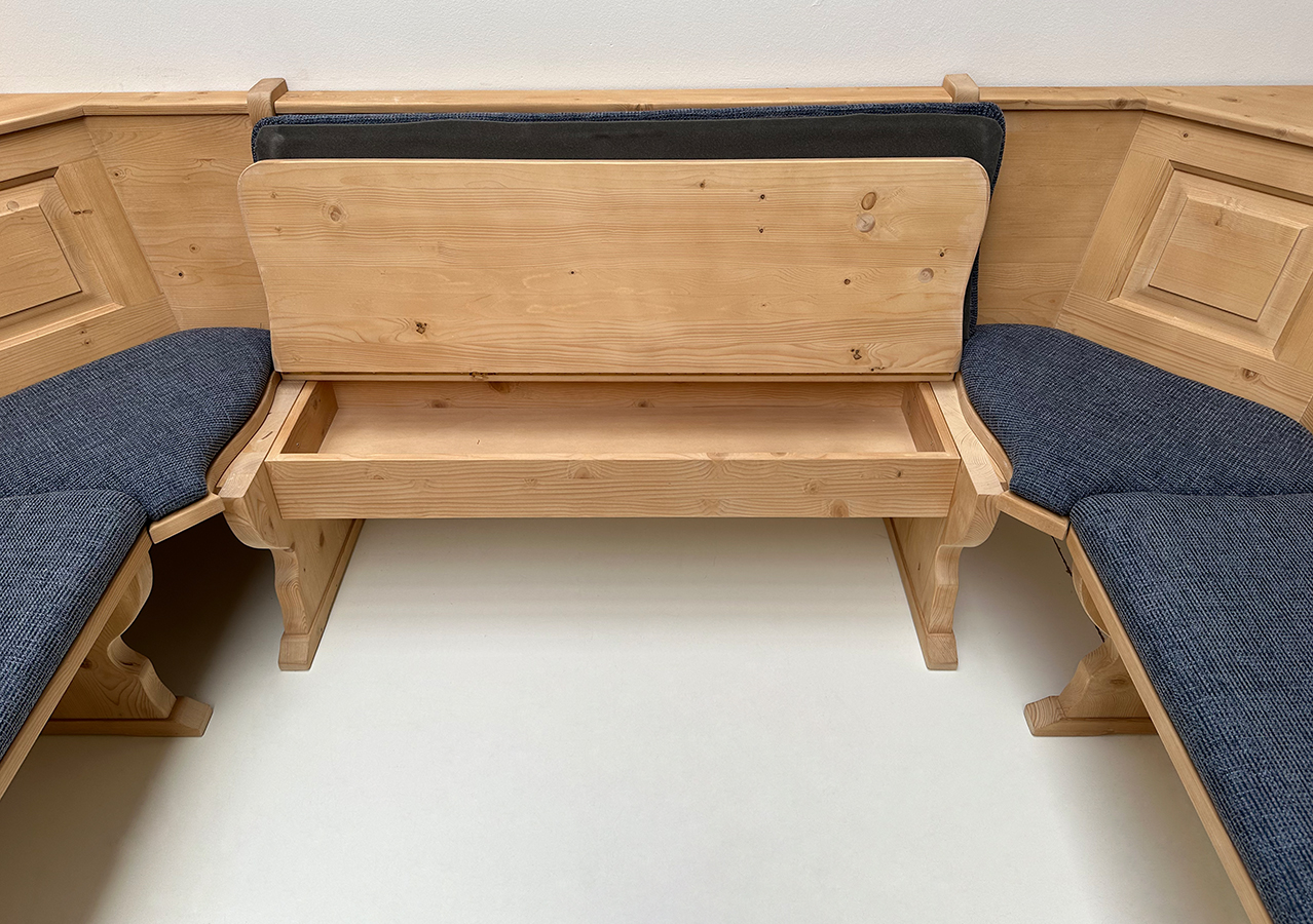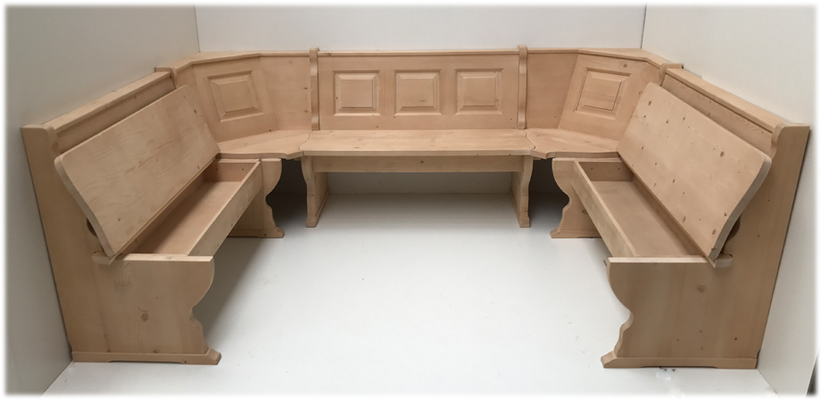 Eckbank Schenkelmaß 185/241/185 cm, mit Truhen Alles in Fichte massiv, Rosner gebeizt und gewachst