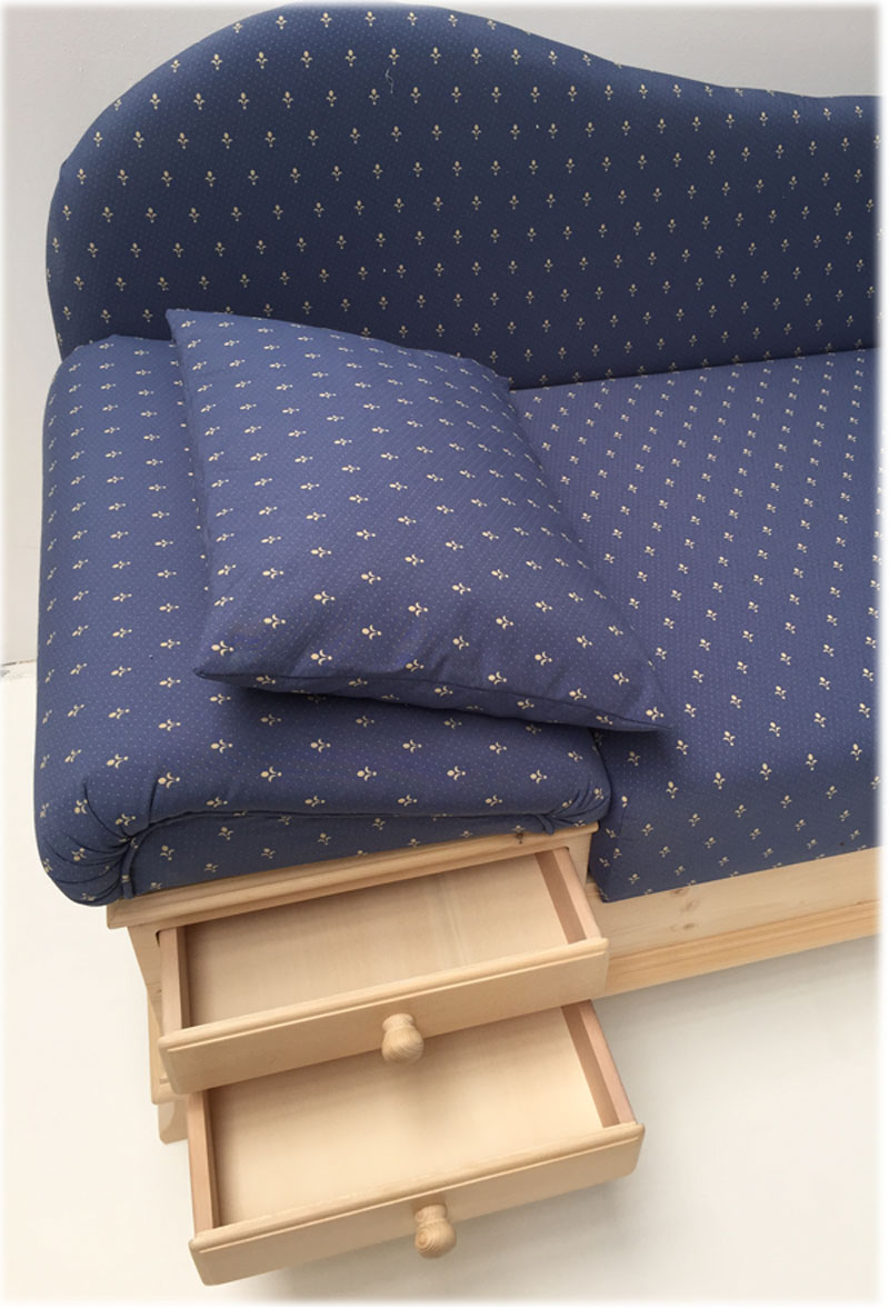 Kopfteil links, hier im Stoff KUNDL blau, 222051-61 47% Polyester, 53% Polyacryl, 32.000 Scheuertouren, 144 cm Breite, 345 g/m², 4,2 cm Rapport, Abm: 195/75/86 cm, (L/T/H), Sitzhöhe 45 cm, Polsterung Komfort Kaltschaum, Kopfteil höhenverstellbar, Sitz mit Klappfunktion, Holzteile: Fichte,