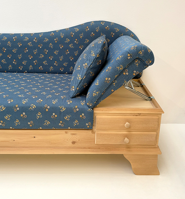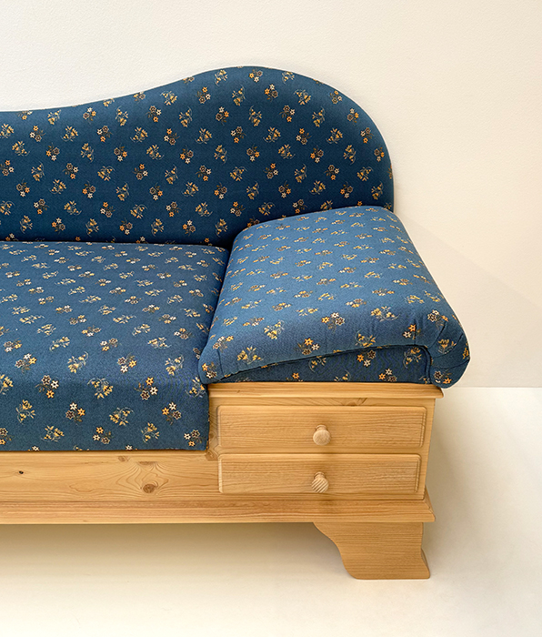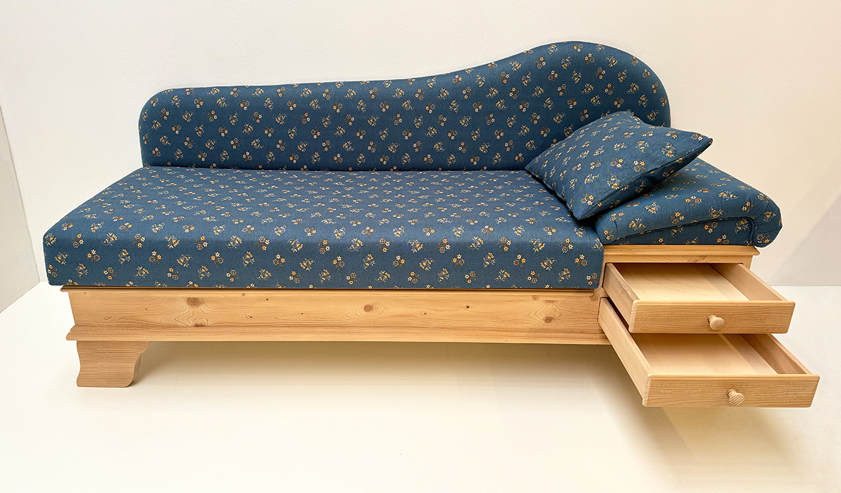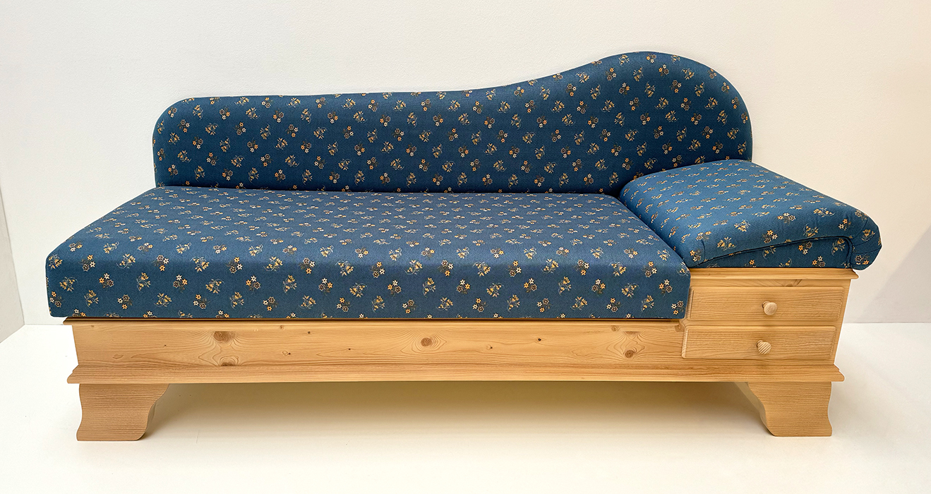 Sofa Liege Chiemgau, Kopfteil rechts, Sitzhöhe 50 cm, Mülheim Streublume blau, 38 Lagerstoffe !!!