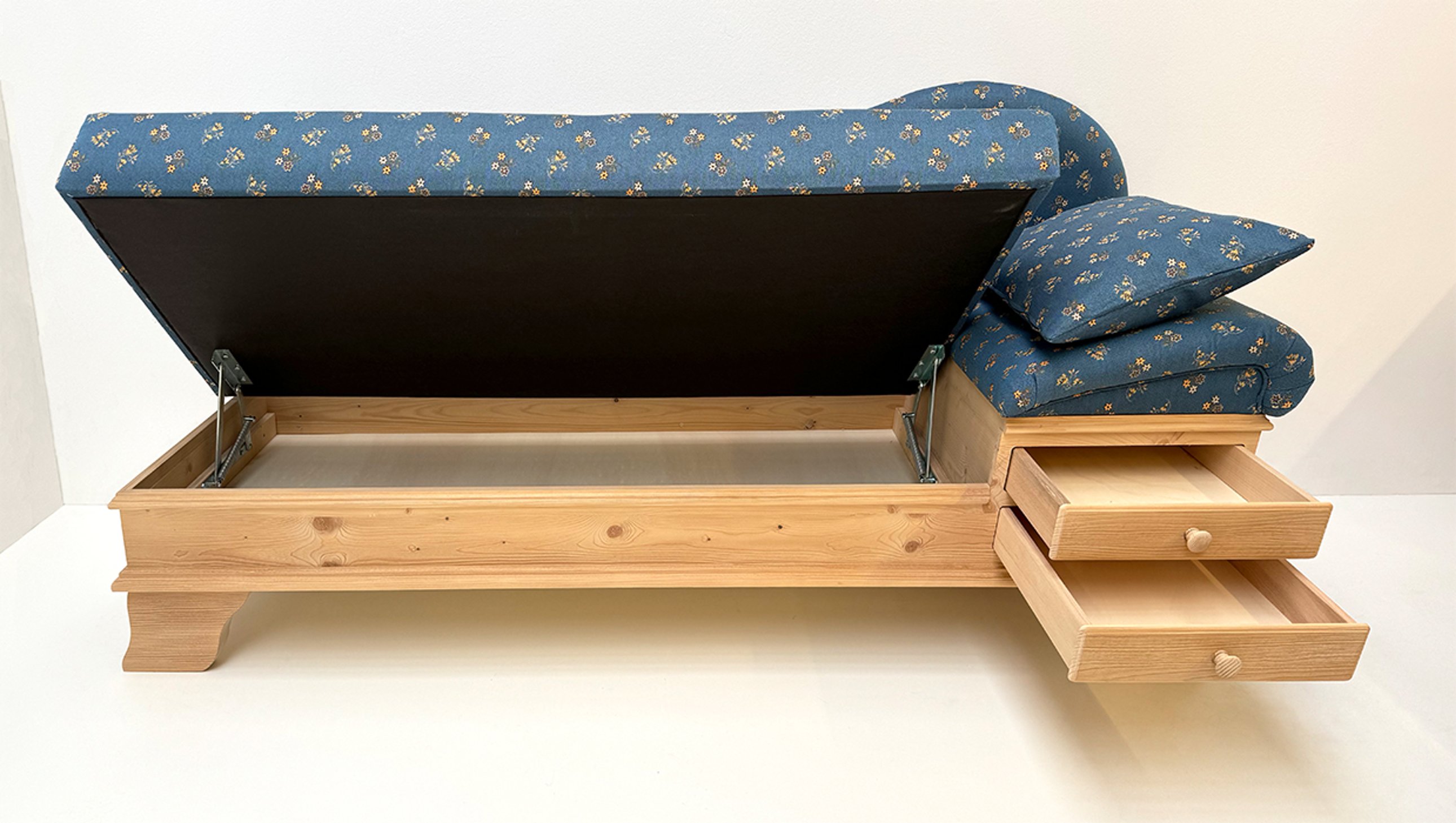 Kopfteil rechts wenn man davorsteht und auf die Liege sieht, Kopfteil höhenverstellbar, Sitz mit Klappfunktion, Holzteile: Fichte,